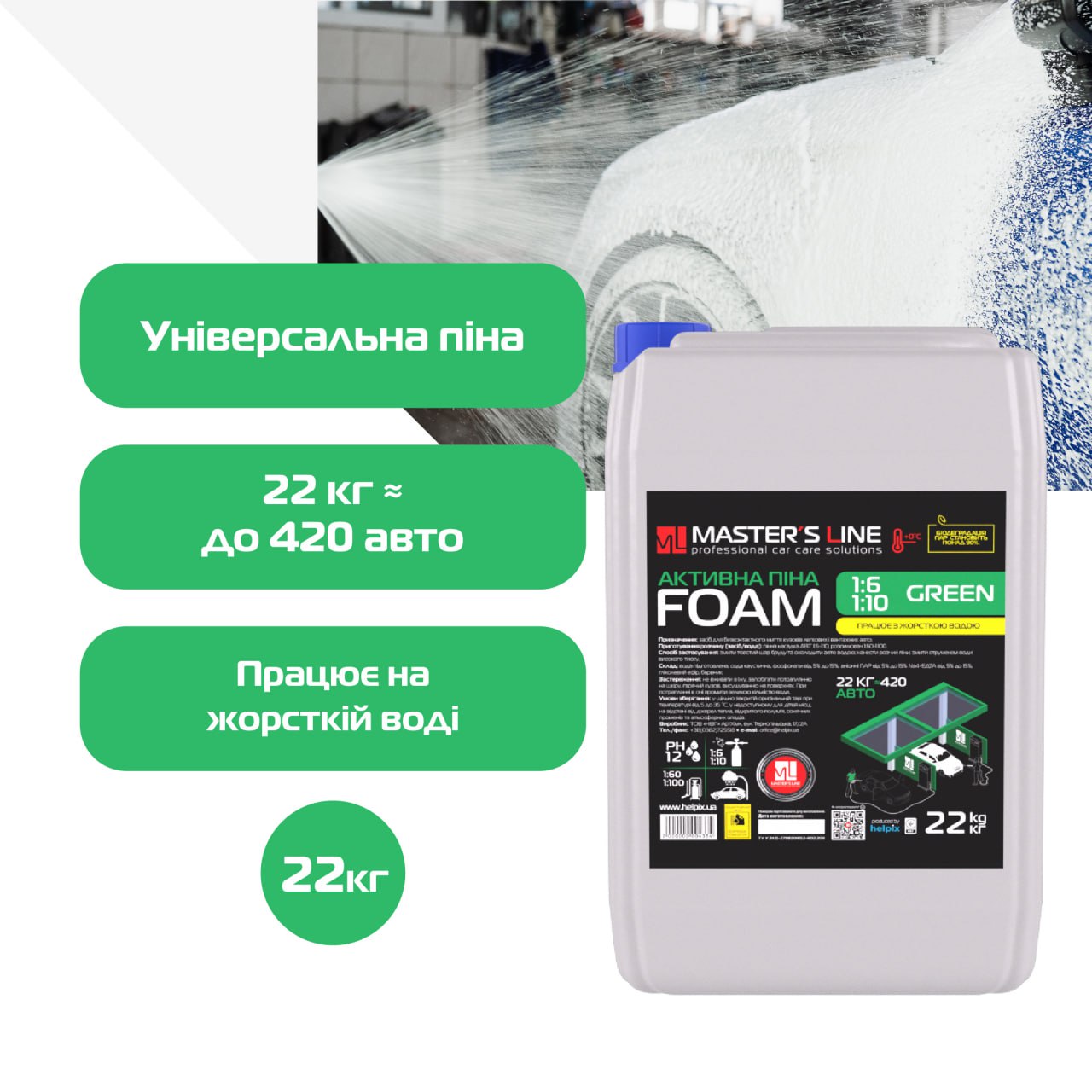 Активна піна Master’s Line «Green» призначена для безконтактної мийки легкового та вантажного транспорту. Швидко та ефективно видаляє забруднення різного характеру (дорожній бруд, пісок, чорнозем, пташиний послід, сліди тваринного та рослинного походження).