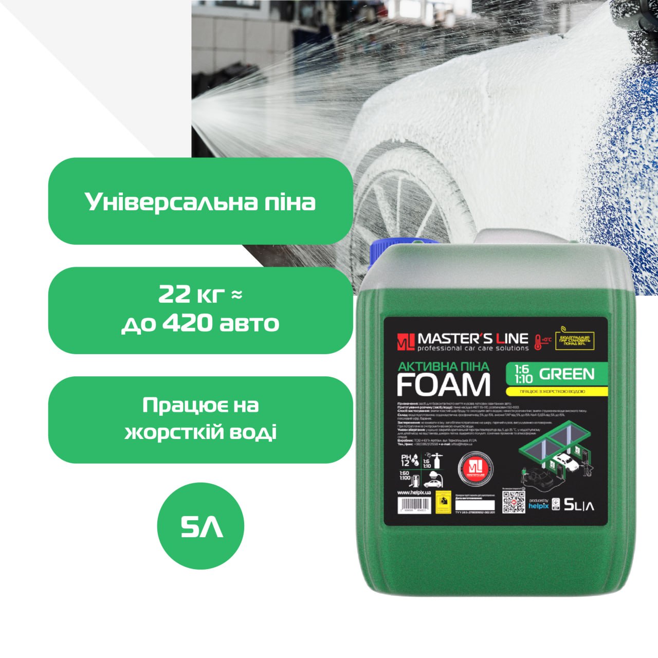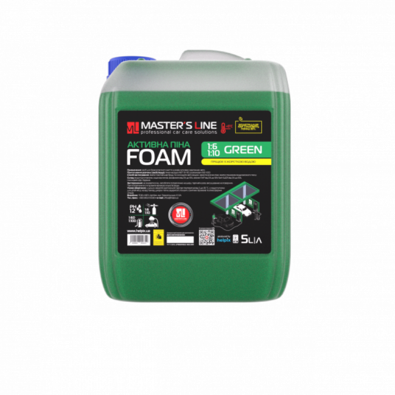 Активна піна Master’s Line «Green» призначена для безконтактної мийки легкового та вантажного транспорту. Швидко та ефективно видаляє забруднення різного характеру (дорожній бруд, пісок, чорнозем, пташиний послід, сліди тваринного та рослинного походження).