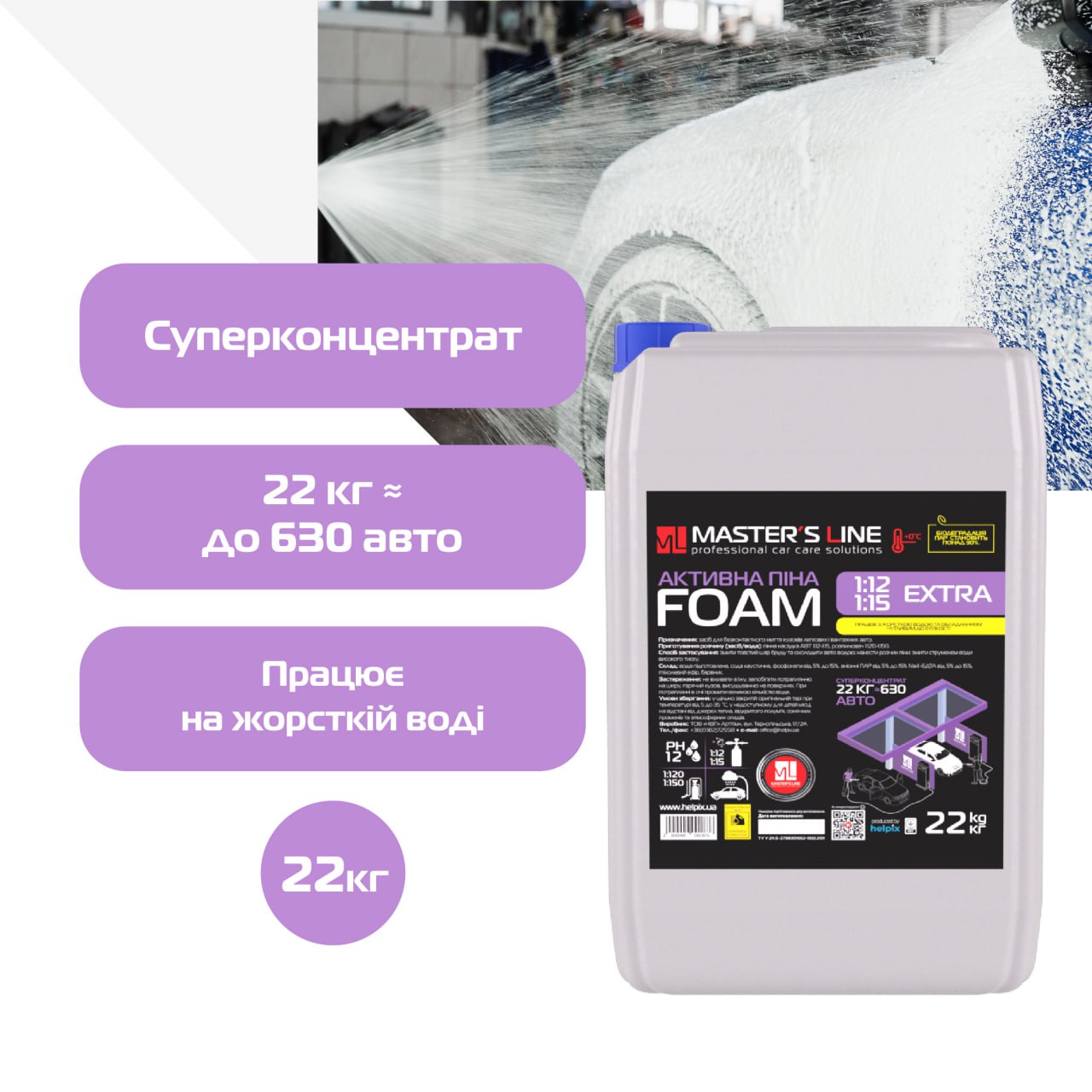 Активна піна Master’s Line «Extra» призначена для безконтактної мийки легкового та вантажного транспорту. Швидко та ефективно видаляє забруднення різного характеру (дорожній бруд, пісок, чорнозем, пташиний послід, сліди тваринного та рослинного походження).