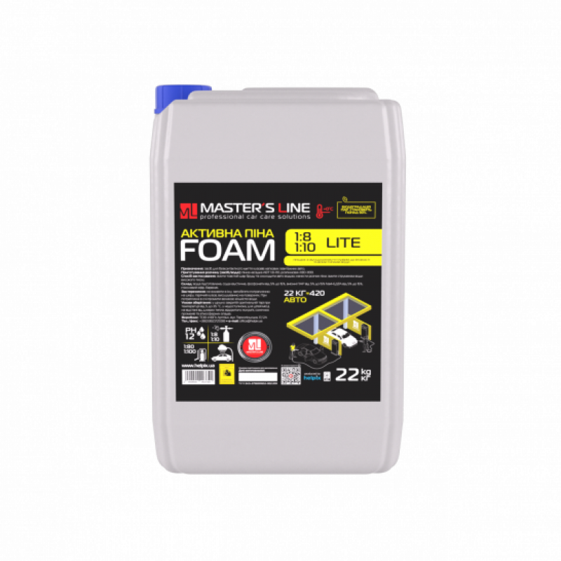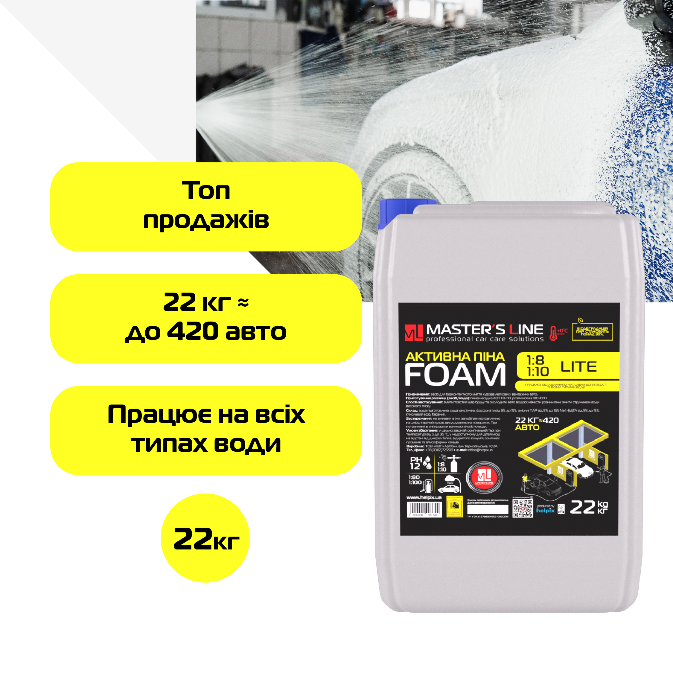 Активна піна Master’s Line «Lite» призначена для безконтактної мийки легкового та вантажного транспорту. Швидко та ефективно видаляє забруднення різного характеру (дорожній бруд, пісок, чорнозем, пташиний послід, сліди тваринного та рослинного походження).