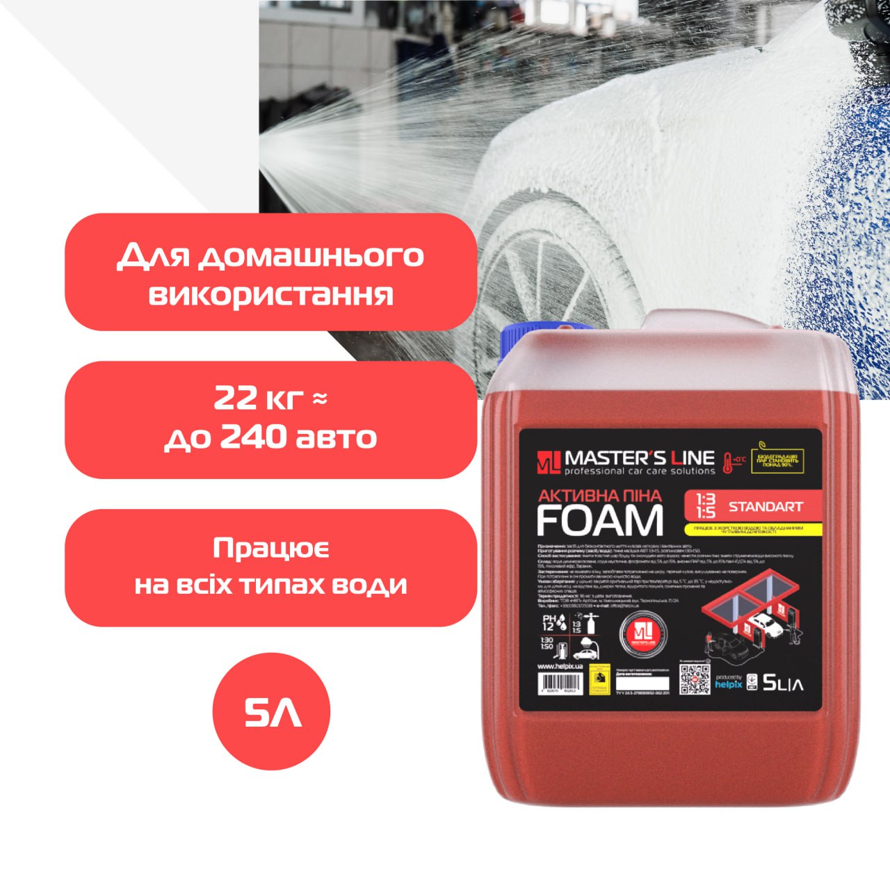 Активна піна Master's Line «Standart» призначена для безконтактної мийки легкового та вантажного транспорту. Швидко та ефективно видаляє забруднення різного характеру (дорожній бруд, пісок, чорнозем, пташиний послід, сліди тваринного та рослинного походження).