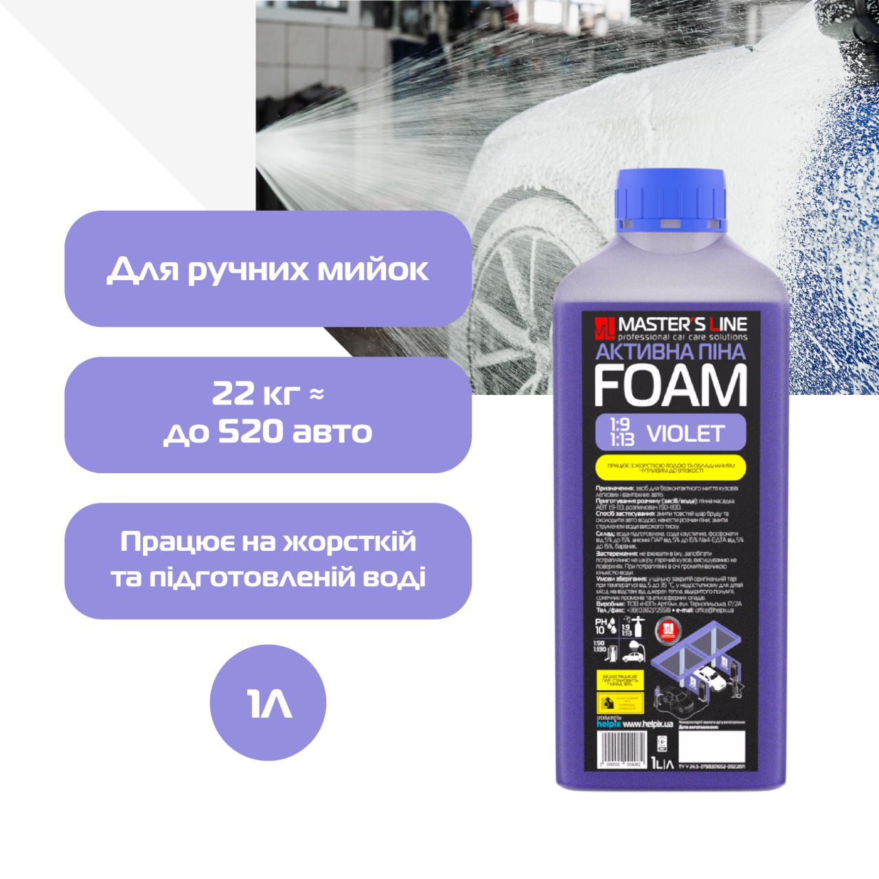 Активна піна Master’s Line «Violet» призначена для безконтактної мийки легкового та вантажного транспорту. Швидко та ефективно видаляє забруднення різного характеру. Ідеально підійде для першої фази мийки авто, видалення динамічних забруднень (дорожній бруд, пісок, чорнозем, пташиний послід, сліди тваринного та рослинного походження).