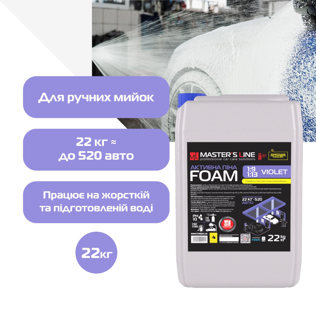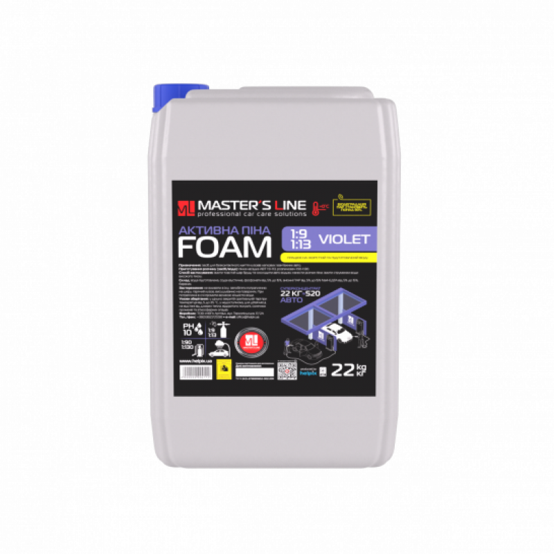 Активна піна Master’s Line «Violet» призначена для безконтактної мийки легкового та вантажного транспорту. Швидко та ефективно видаляє забруднення різного характеру. Ідеально підійде для першої фази мийки авто, видалення динамічних забруднень (дорожній бруд, пісок, чорнозем, пташиний послід, сліди тваринного та рослинного походження).