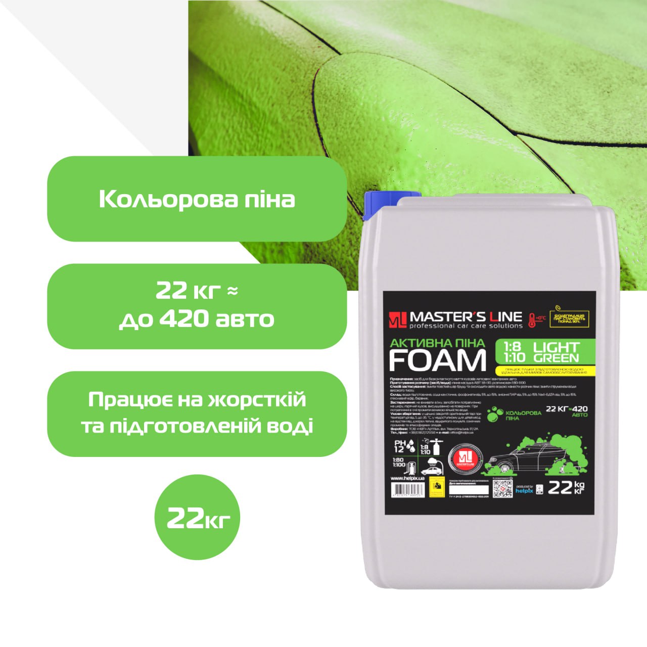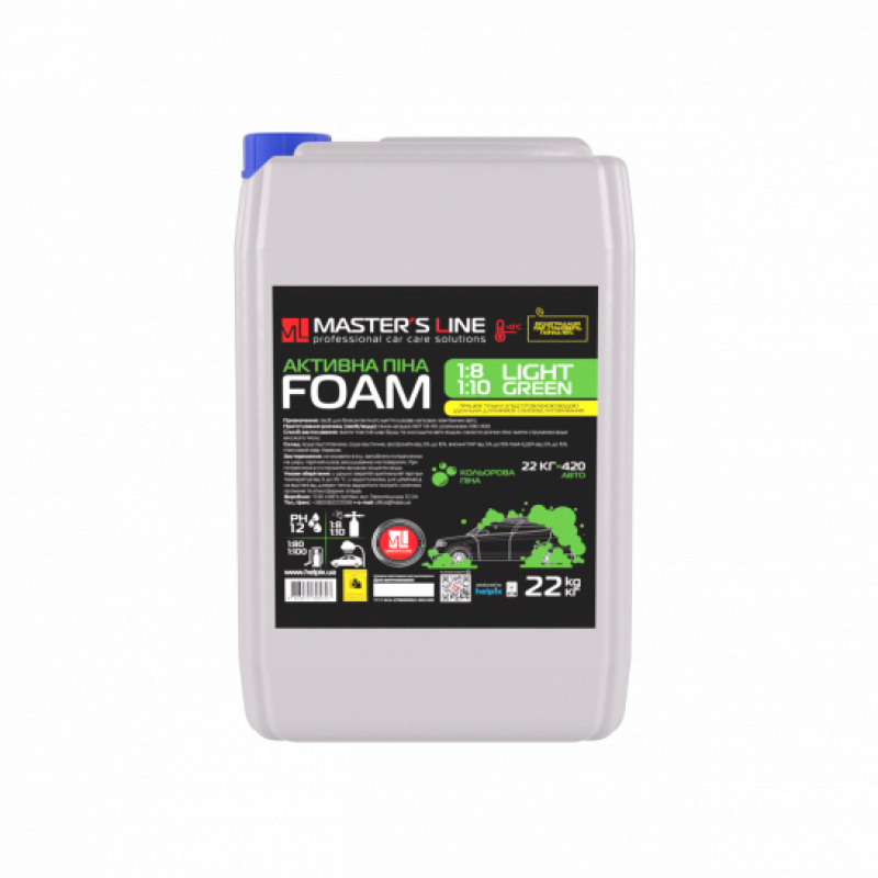 Кольорова активна піна Master’s Line «Lite Green» призначена для безконтактної мийки легкового та вантажного транспорту. Швидко та ефективно видаляє забруднення різного характеру (дорожній бруд, пісок, чорнозем, пташиний послід, сліди тваринного та рослинного походження).