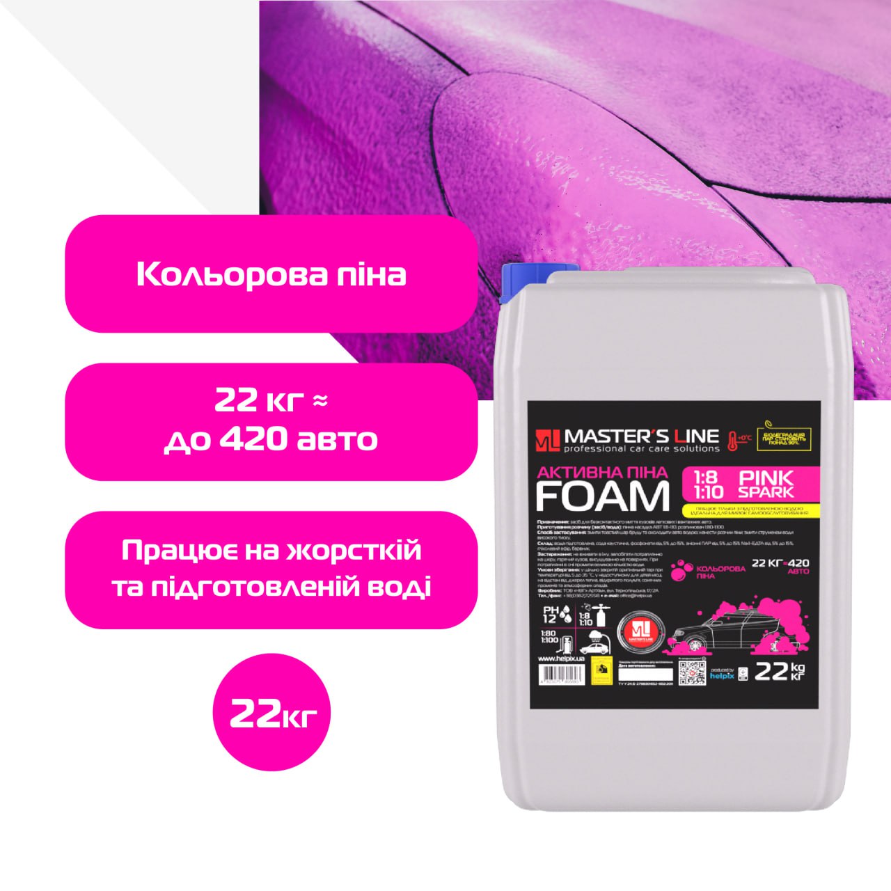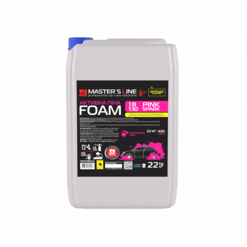 Кольорова активна піна Master’s Line «Pink Spark» призначена для безконтактної мийки легкового та вантажного транспорту. Швидко та ефективно видаляє забруднення різного характеру (дорожній бруд, пісок, чорнозем, пташиний послід, сліди тваринного та рослинного походження).