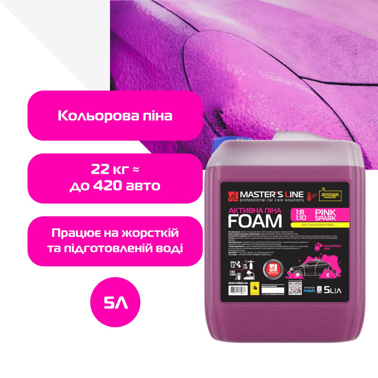 Кольорова активна піна Master’s Line «Pink Spark» призначена для безконтактної мийки легкового та вантажного транспорту. Швидко та ефективно видаляє забруднення різного характеру (дорожній бруд, пісок, чорнозем, пташиний послід, сліди тваринного та рослинного походження).