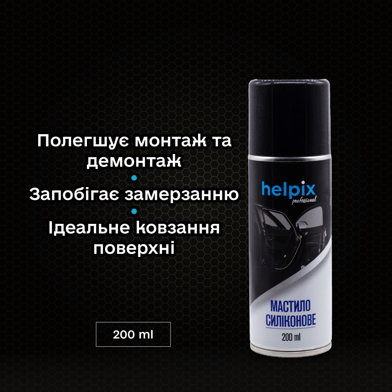 Мастило силіконове Helpix Professional використовується для обробки та усунення скрипів різноманітних деталей автомобіля: молдингів, пасів, гумових ущільнювачів, дверних замків, направляючих склопідіймачів, акумуляторних дротів, пластикових деталей. Може використовуватись як для обробки деталей авто, так і у побуті і в промисловості.