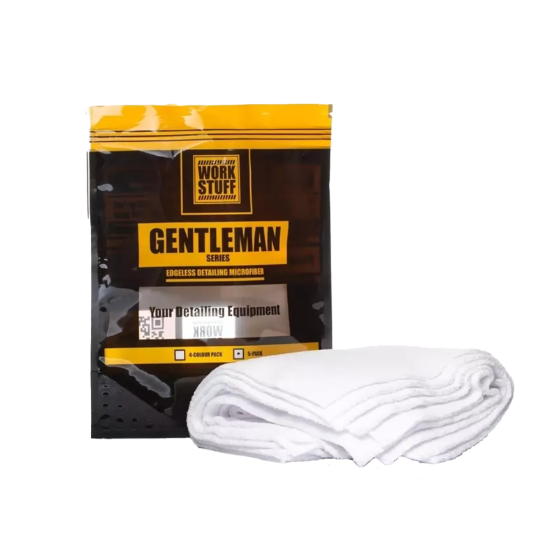 Work Stuff Gentleman Basic 5-pack White — набір з 5 мікрофібр білого кольору розмірами 40 на 40 см та щільністю тканини 350 г/м². Лазерне кромкування країв, дві сторони з довгим та коротким вором дозволяють використовувати мікрофібри для видалення полірувальної пасти з кузова, розполірування захисних покриттів та для роботи в салоні (з шкіряними та пластиковими елементами).