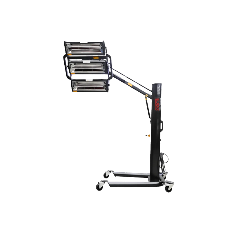 SGCB Curing Lamp With Touch Key panel, Automatic Distance and Temperature Sensors – пересувна інфрачервона короткохвильова лампа. Підходить для сушіння всіх типів лакофарбових матеріалів. Три кварцові галогенні касети по 1000 Вт кожна рівномірно прогрівають пофарбовані деталі до металу, прискорюючи процес випаровування розчинника.