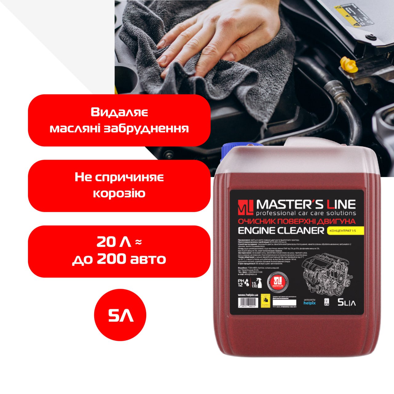 Очисник поверхні двигуна Master’s Line Motor Cleaner призначений для швидкого та ефективного видалення забруднень з поверхні двигуна. Долає будь-які види забруднень: пилові, залишки від паливно-мастильних матеріалів та дорожніх реагентів. Може використовуватись для легкових, вантажних автомобілів та спецтехніки.