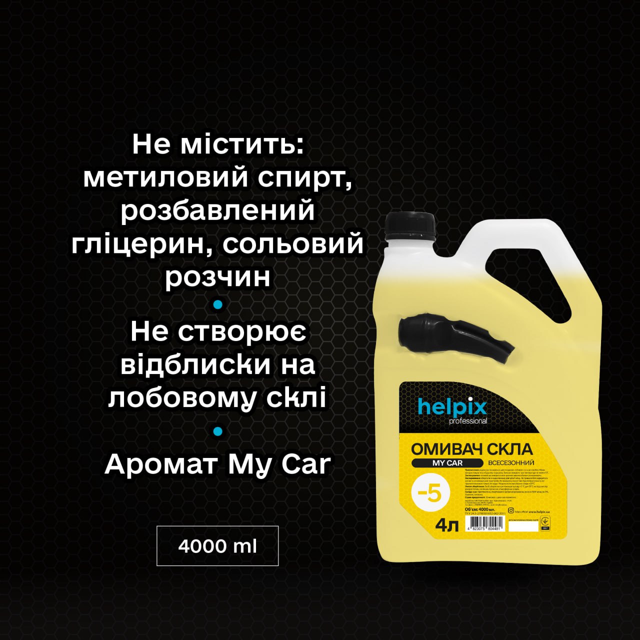 Зимовий омивач скла Helpix Professional "My Car -5°С" призначений для очищення скла та оптичних приладів автомобіля від снігу, льоду, солі, бруду і дорожніх реагентів. Використовується при температурі не нижчій за -5°С.