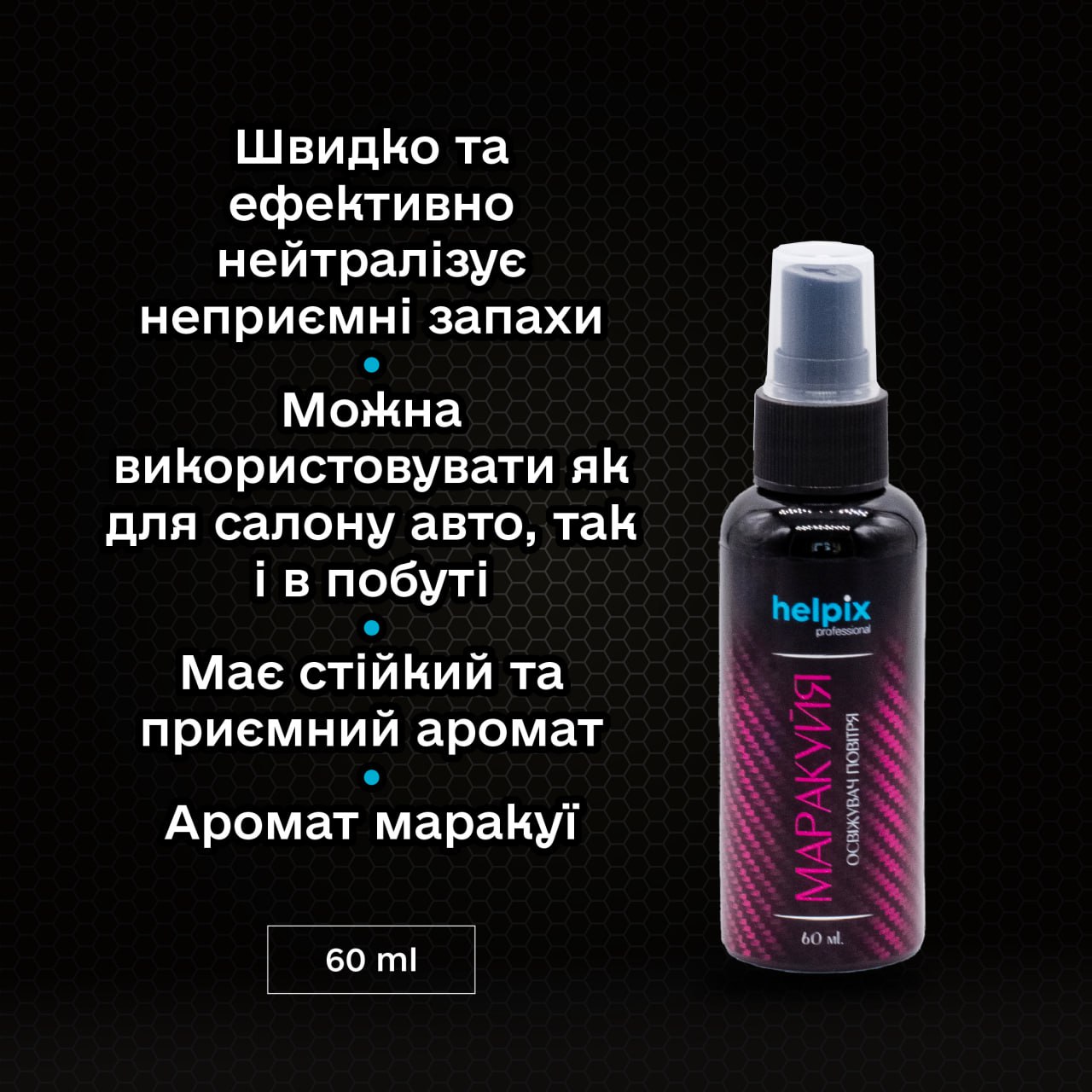 Освіжувач повітря Helpix Professional «Маракуйя» призначений для швидкої та ефективної ароматизації салону автомобіля або приміщень, а також для усунення неприємних запахів. Може використовуватися як для салону авто, так і у побуті.
