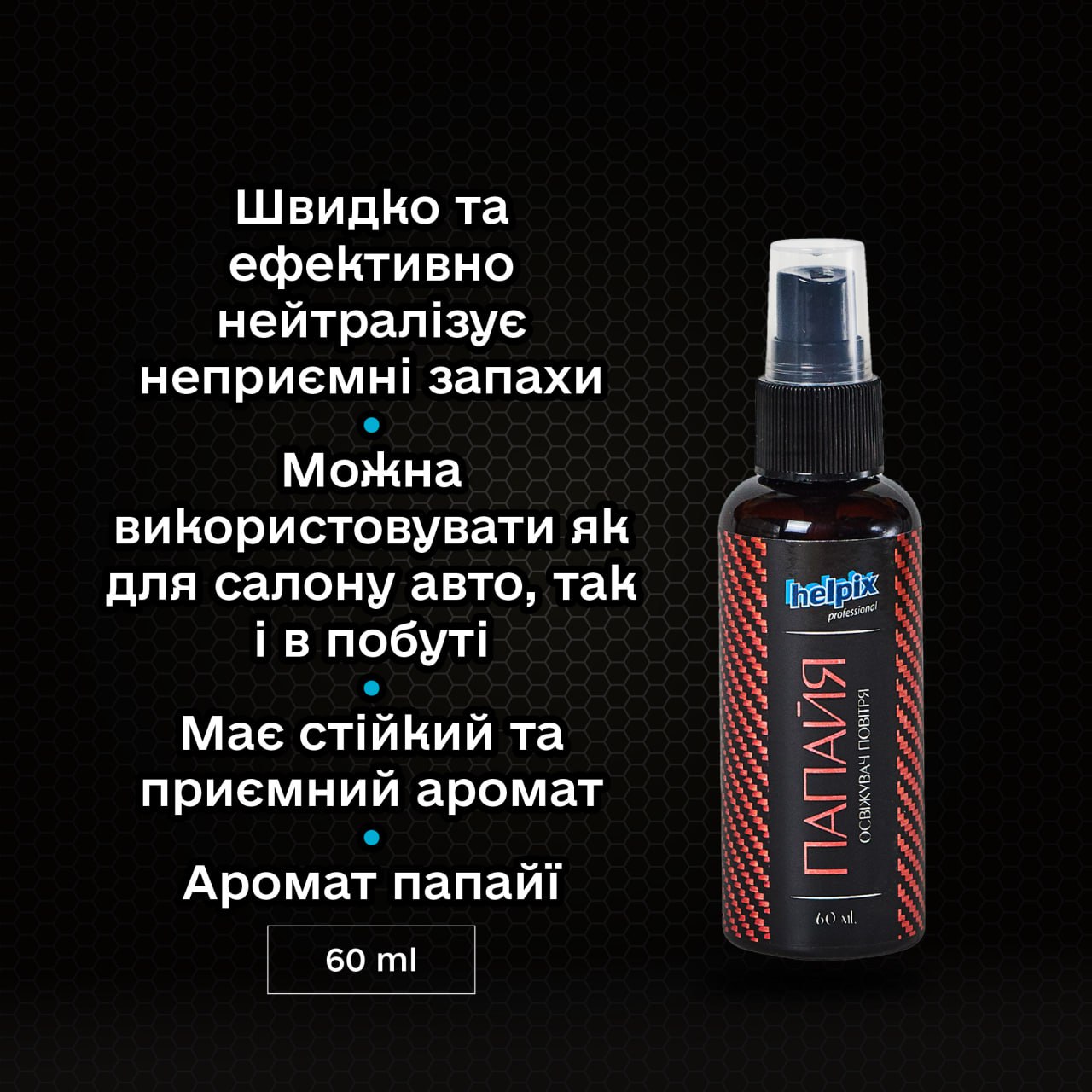 Освіжувач повітря Helpix Professional «Папайя» призначений для швидкої та ефективної ароматизації салону автомобіля або приміщень, а також для усунення неприємних запахів. Може використовуватися як для салону авто, так і у побуті.