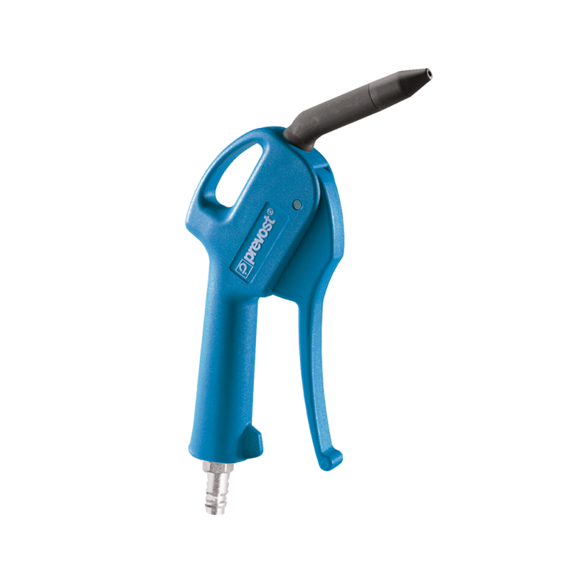 Компактний продувний пістолет Prevost PrevoS1 Blow Gun with Protective Air Curtain виконаний з неслизького поліамідного композиту, стійкого до подряпин, а також накопичення пилу. Обладнаний вигнутим наконечником спрямованої дії, що перешкоджає утворенню подряпин, розробленим відповідно до стандартів OSHA (управління з охорони праці США). Плавний хід курка дає змогу точно регулювати потужність повітряного потоку, а латунна вставка G ¼ дюйма забезпечить герметичне з'єднання зі швидкознімною муфтою.
