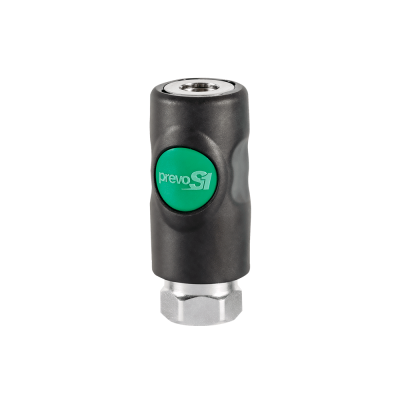Prevost Paralell Female Thread Coupler — швидкознімне композитне з'єднання з внутрішнім різьбленням G 3/8. Швидкоз'єми PrevoS1 — це просте та інтуїтивне використання. Завдяки своїй ергономічній і компактній формі, вони оптимізують витрату повітря і запобігають витоку тиску з системи. Витяг шланга або пістолета проводиться в одне натискання кнопки на швидкоз'ємі.