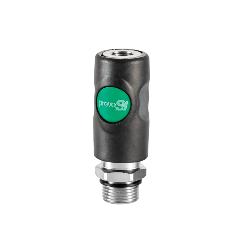 Prevost Paralell Male Thread Coupler — швидкознімне композитне з'єднання із зовнішнім різьбленням G 1/4. Швидкоз'єми PrevoS1 — це просте та інтуїтивне використання. Завдяки своїй ергономічній і компактній формі, вони оптимізують витрату повітря і запобігають витоку тиску з системи. Витяг шланга або пістолета проводиться в одне натискання кнопки на швидкоз'ємі.