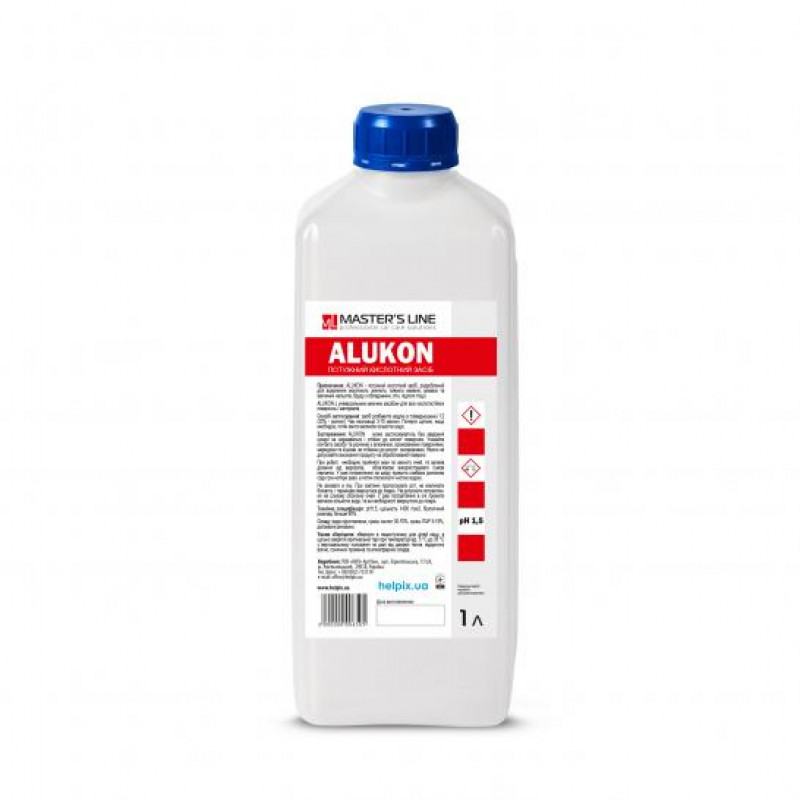 Застереження: ALUKON може застосовуватись без завдання шкоди на нержавіючих і стійких до кислот поверхнях. Уникайте контакту засобу та розчинів з алюмінієм, хромованими поверхнями, мармуром та іншими не стійкими до кислот матеріалами. Ніколи не допускайте висихання продукту на оброблюваній поверхні.