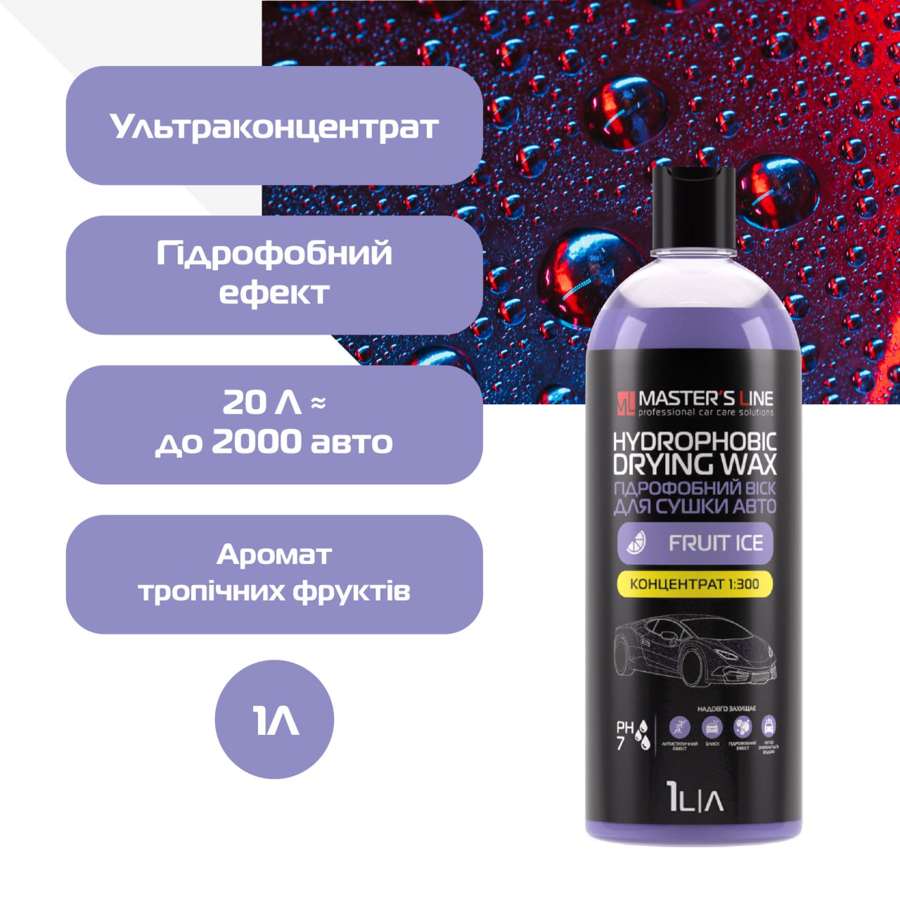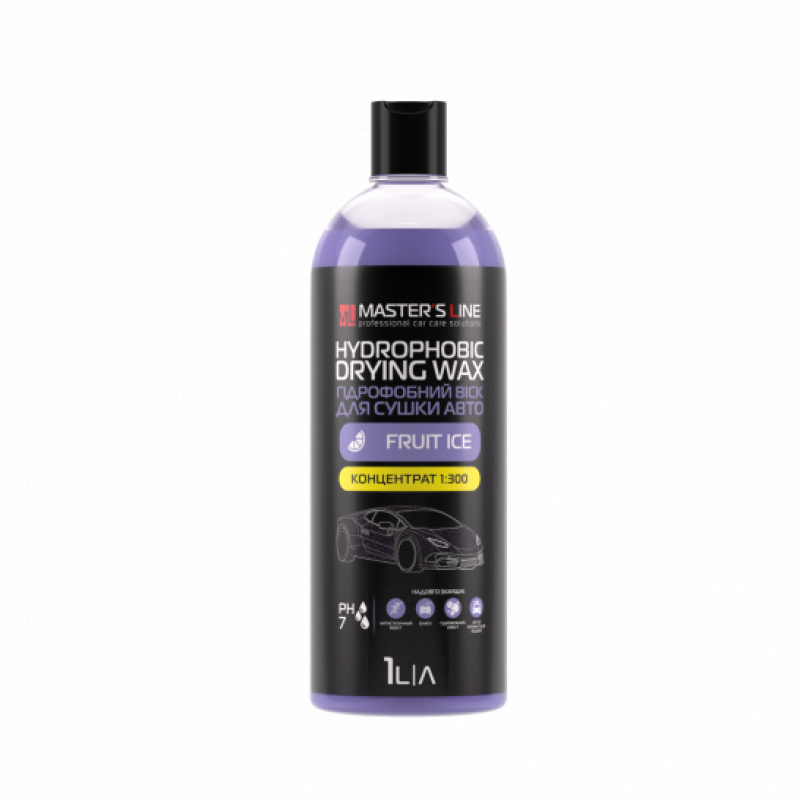 Призначення: висококонцентрований гідрофобний засіб для тривалої консервації поверхні автомобіля після мийки. Завдяки високому водовідштовхувальному ефекту, забезпечує швидке висихання поверхні авто, створює антистатичний ефект, утворює тонку захисну плівку. Надовго захищає оброблену поверхню від від проникнення води, бруду та впливу зовнішнього середовища, має ефект самоочищення. Надає глибокого блиску. Має приємний аромат «Fruit ice».