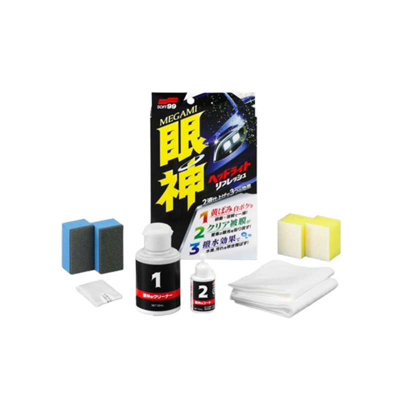 SOFT99 MEGAMI Headlight Refresh – набір для догляду за пластиковими фарами, що складається з очищувача жовтизни та захисного кварцового покриття. Дозволяє повернути фарам заводську прозорість та блиск, захистити від подальшого вицвітання, вигоряння та пожовтіння, а також від негативного впливу агресивної автохімії та факторів навколишнього середовища.