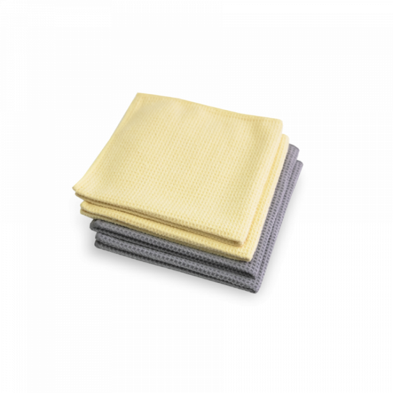Ідеальна серветка для очищення скла та його сухого протирання без розлучень. Унікальне плетіння гарантує відмінну здатність розпушування бруду та висихання без розлучень за допомогою Glass Cleaner, Glas Star, SpeedGlassCleaner або Allround Surface Cleaner. Завдяки високій щільності (320 г/м²) тканина зберігає свою міцність навіть після багаторазового використання. У поєднанні із засобом Glas Star (Gs) ідеально підходить для видалення залишків воску та знежирення. Дві жовті та дві сірі серветки (наприклад, для вологого очищення та протирання насухо).