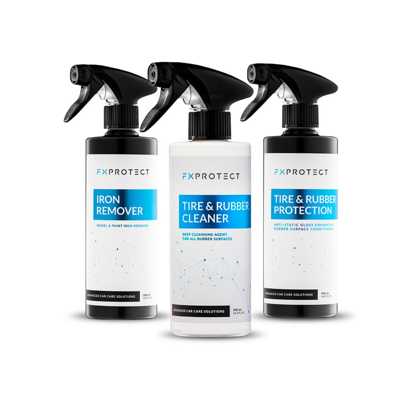 - FX Protect TIRE & RUBBER PROTECTION 0.5 – зволожує і захищає гуму і гумові елементи. Надає глибокий чорний колір, сяючий блиск і тривалий захист від ультрафіолетових променів, солей і кислотних дощів.