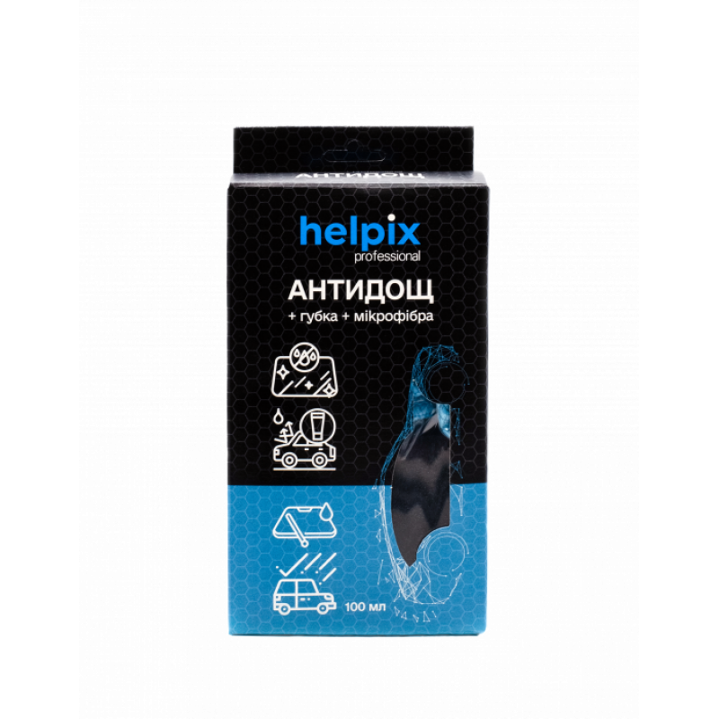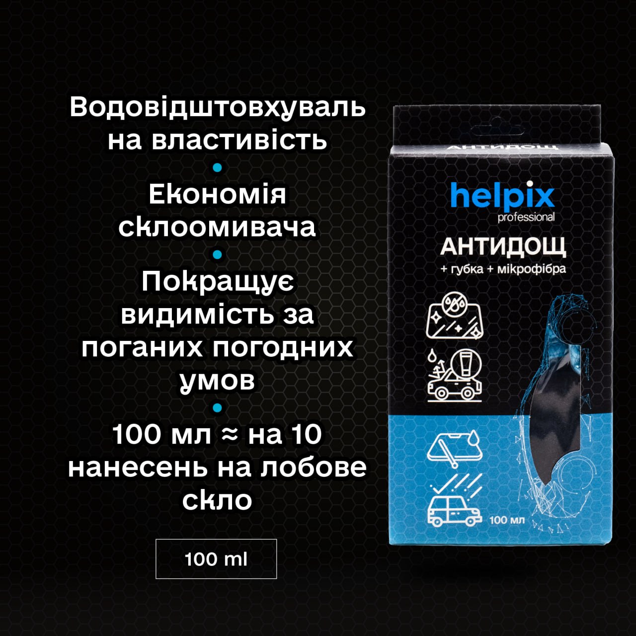 Антидощ Helpix Professional – це засіб для обробки автомобільного скла, який утворює на поверхні тонку, прозору, заповнюючу найдрібніші нерівності плівку, що сприяє швидкому відштовхуванню води (гідрофобізація поверхні) й забезпечує чудову видимість для максимальної безпеки за складних погодних умов (злива, крижаний дощ).