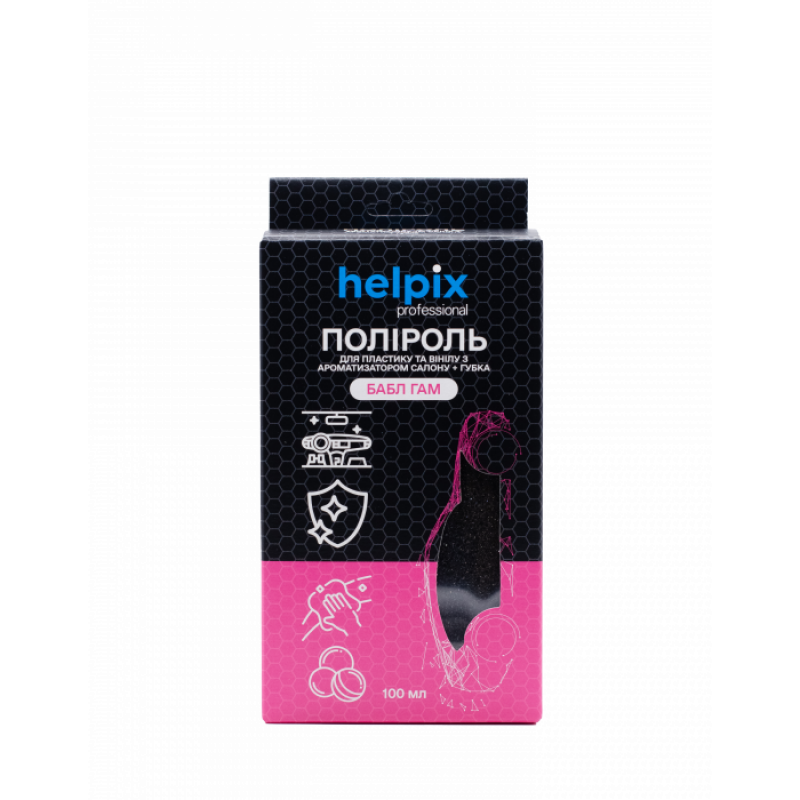 Поліроль для пластику та вінілу Helpix Professional "Бабл гам" використовується для очищення і захисту панелі приладів, а також усіх деталей з пластику, дерева, гуми і вінілу всередині авто. Володіє приємним ароматом жувальної гумки, який виступає в ролі ароматизатора салону впродовж довгого періоду, знешкоджуючи запах тютюну, пилу та ін.