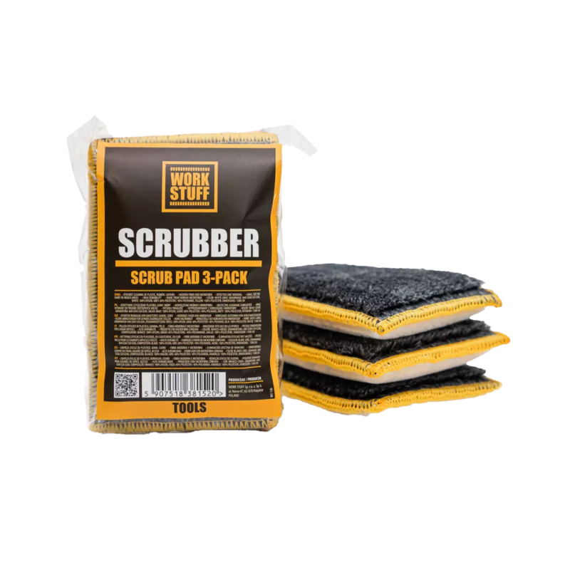 Work Stuff SCRUBBER Pad 3-pack – набір із трьох двосторонніх мікрофібрових аплікаторів, призначених для ефективної та безпечної очистки різних поверхонь автомобіля. Сторона білого кольору виконана з м'якої мікрофібри із щільністю тканини 840 г/м², яка використовується для делікатного очищення та видалення забруднень без ризику пошкодження делікатних поверхонь елементів інтер'єру. Сторона з сірого кольору виконана з грубшої тканини із щільністю 320 г/м² та підходить для видалення стійких забруднень.