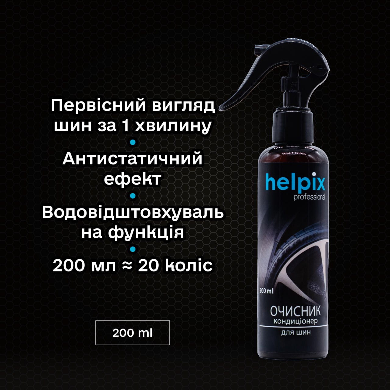 Очисник-кондиціонер для шин Helpix Professional – це засіб призначений для очистки, консервації, тривалої гідрофобізації та періодичного догляду за шинами та іншими гумовими деталями авто. Ідеально підходить для догляду за пластиковими деталями екстер'єру авто з