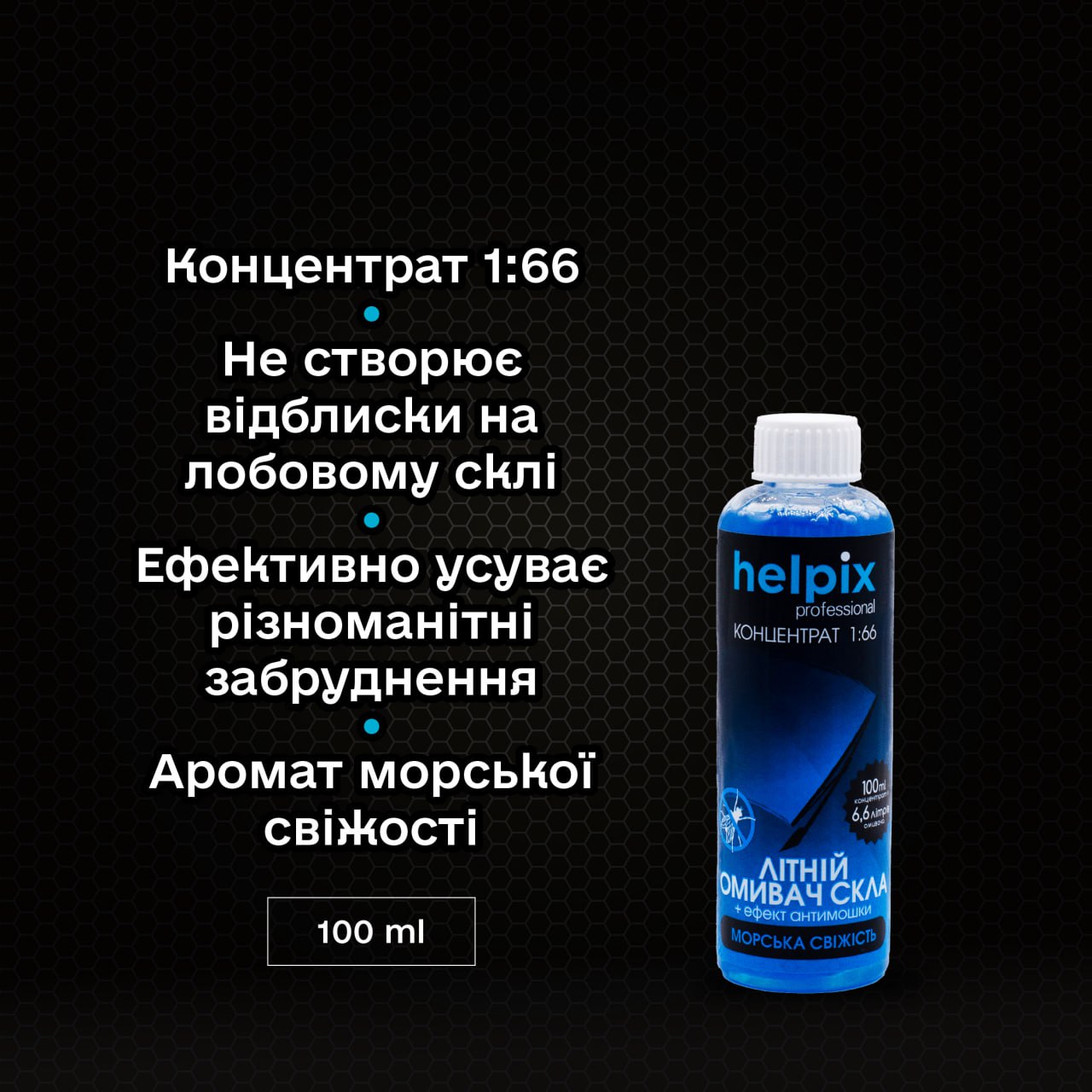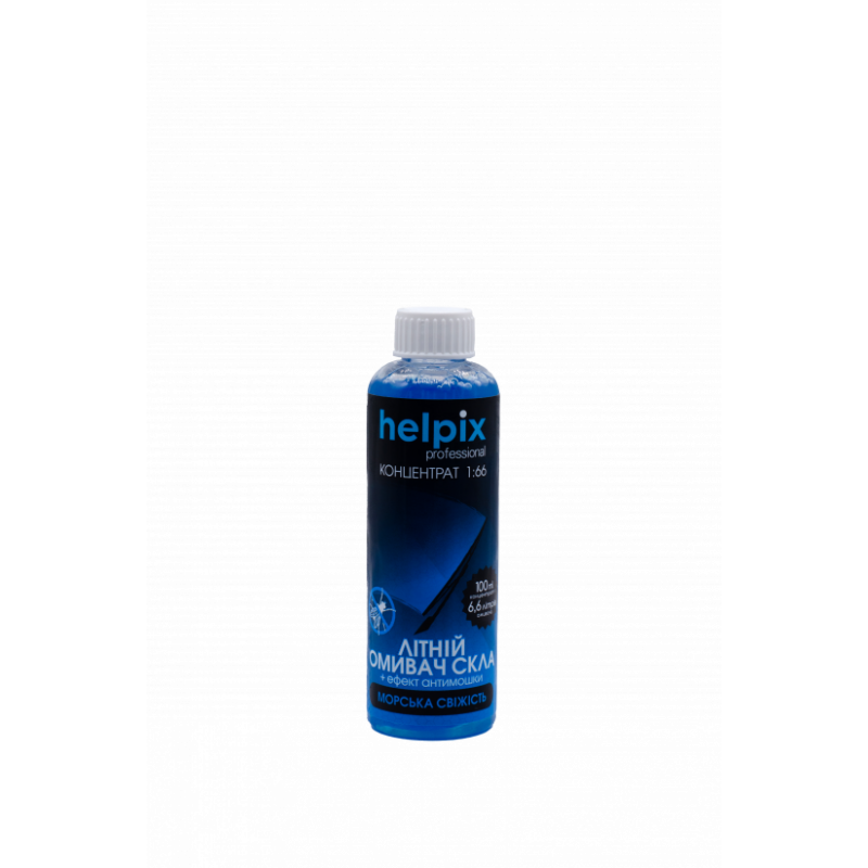 Концентрат омивача скла літній Helpix Professional «Морська свіжість» застосовується для очистки скла та оптичних приладів автомобіля від бруду, пилу, залишків комах, дорожніх реагентів, жирових плям, відбитків пальців, нікотинових та гліцеринових плівок. Використовується після розведення, при температурі не нижчій 0°С.