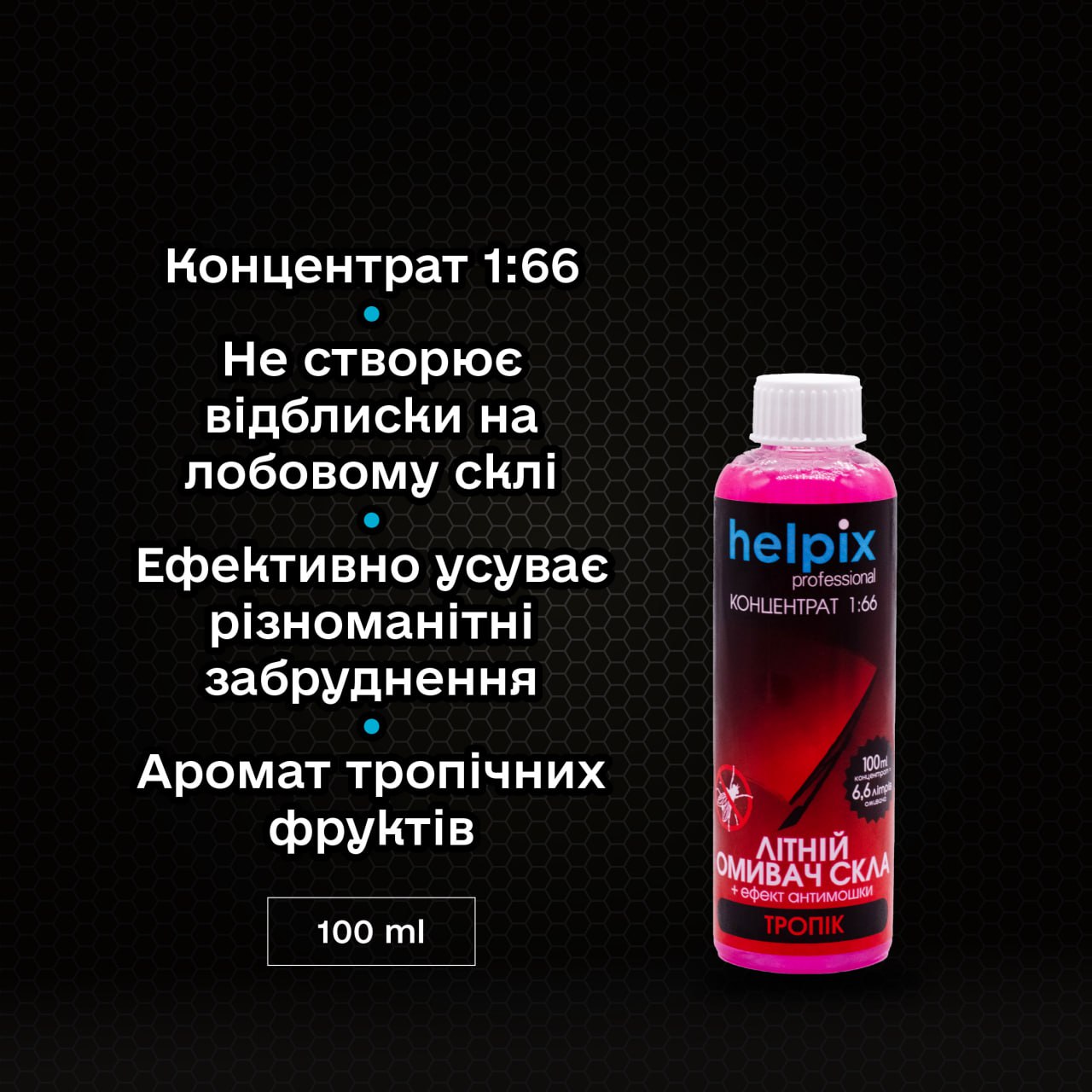 Концентрат омивача скла літній Helpix Professional «Тропік» застосовується для очистки скла та оптичних приладів автомобіля від бруду, пилу, залишків комах, дорожніх реагентів, жирових плям, відбитків пальців, нікотинових та гліцеринових плівок. Використовується після розведення, при температурі не нижчій 0°С.