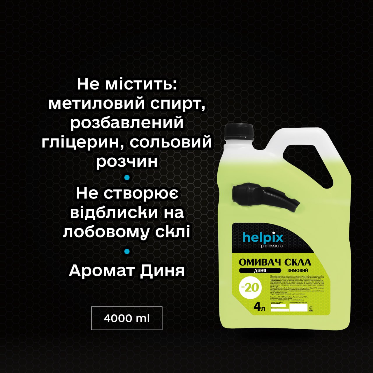 Зимовий омивач скла Helpix Professional "Диня -20°С" призначений для очищення скла та оптичних приладів автомобіля від снігу, льоду, солі, бруду і дорожніх реагентів. Використовується при температурі не нижчій за -20°С.