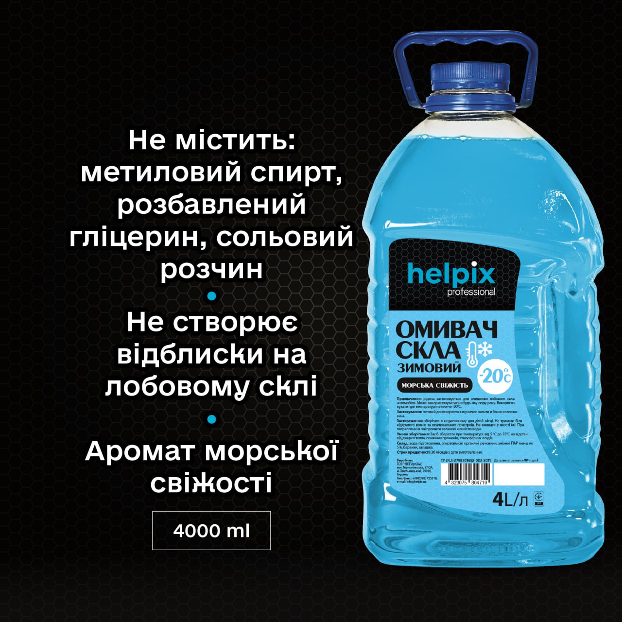 Зимовий омивач скла Helpix Professional "Морська свіжість -20°С" призначений для очищення скла та оптичних приладів автомобіля від снігу, льоду, солі, бруду і дорожніх реагентів. Використовується при температурі не нижчій за -20°С.