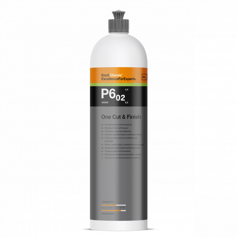 One Cut & Finish P6.02 – це машинна поліроль для постійного видалення полірувального помутніння, голограм та подряпин, а також шліфування зернистістю P 2000 з одночасним ефектом запечатування. Блискуча та довговічна глянсова поверхня створюється за рахунок використання однорідних абразивів. Інноваційний One Cut & Finish P6.02 поєднує в собі оптимальне співвідношення абразивності та блиску для економічної та ефективної роботи з підготовки автомобіля. One Cut & Finish P6.02 економічний, його легко полірувати та легко прати. Містить карнаубський віск та нелеткі силікони. Ступінь шліфування: 6,0 Ступінь блиску: 8,0