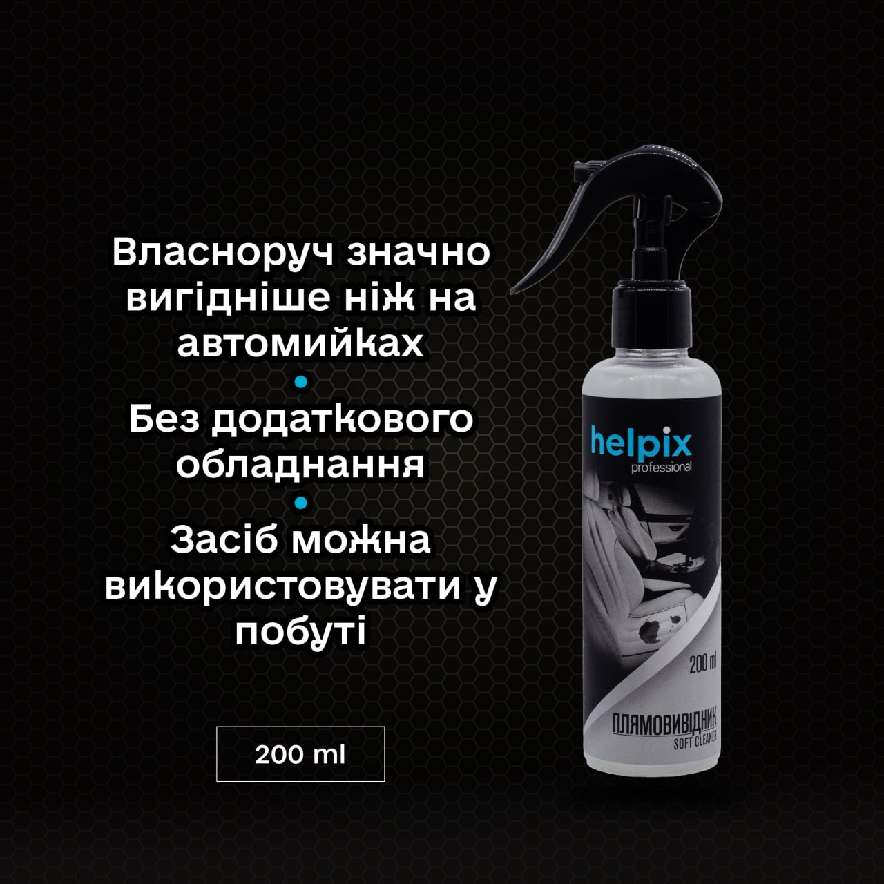Плямовивідник Helpix Professional 200 ml призначений для ефективного очищення та відновлення текстильних, килимових та вінілових покриттів. Може використовуватись як для хімчистки салону авто, так і в побуті для очистки м’яких меблів з текстильною оббивкою.