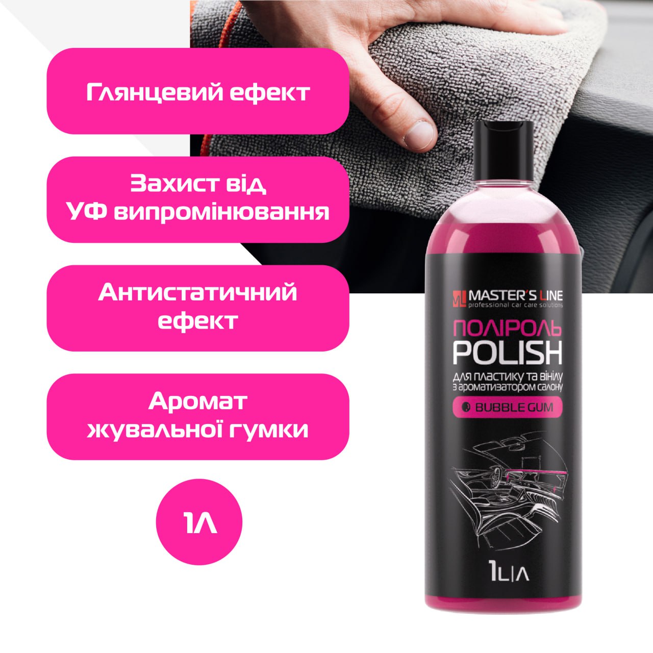 Переваги засобу - поліроль-ароматизатор для пластику та вінілу Master's Line "Бабл Гам":