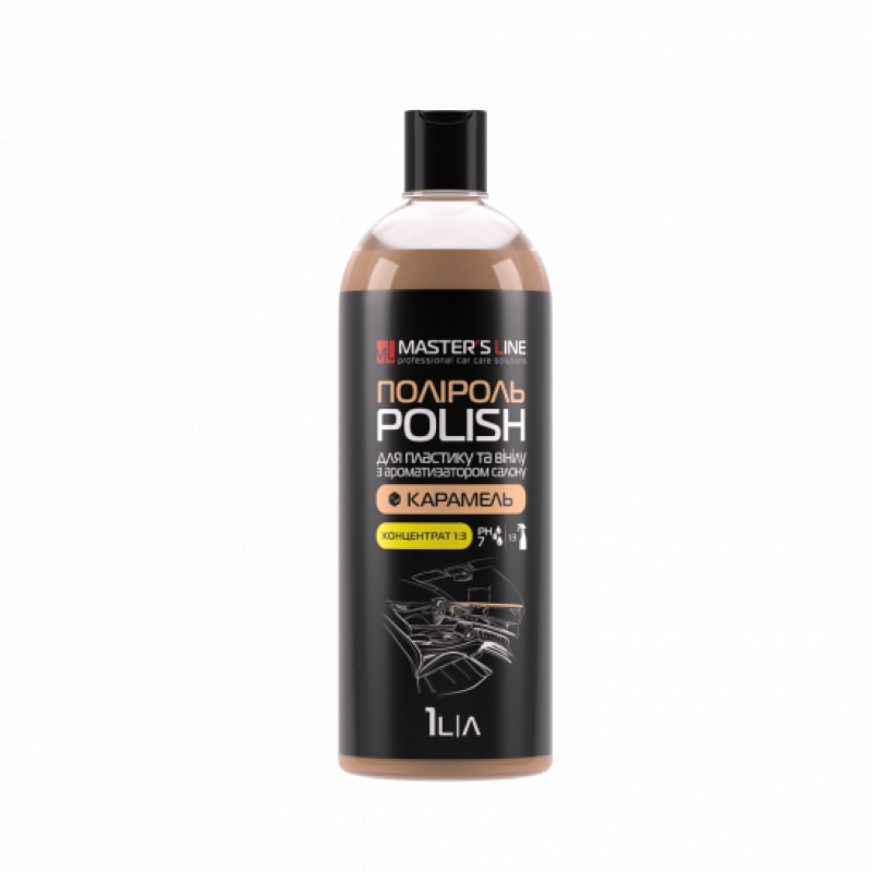Поліроль-ароматизатор для пластику та вінілу Master's Line "Карамель" використовується для очищення і захисту панелі приладів, а також усіх деталей з пластику, дерева, гуми і вінілу всередині авто. Володіє приємним ароматом, який виступає в ролі ароматизатора салону впродовж довгого періоду, знешкоджуючи запах тютюну, пилу та ін.