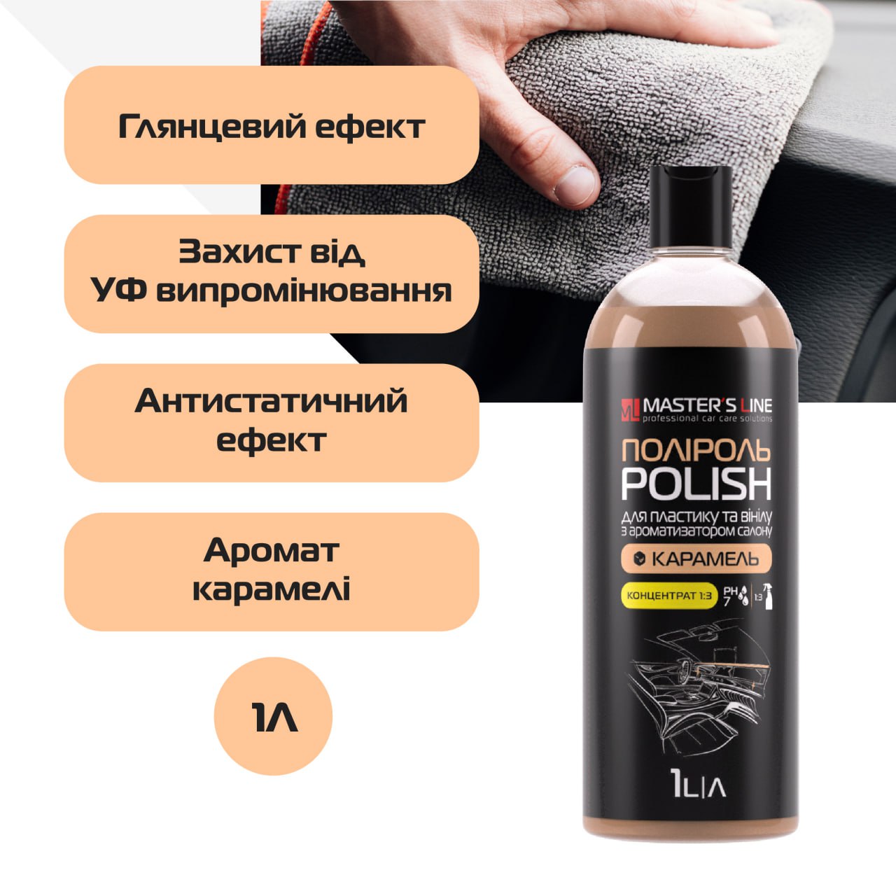 Переваги засобу - поліроль-ароматизатор для пластику та вінілу Master's Line "Карамель":