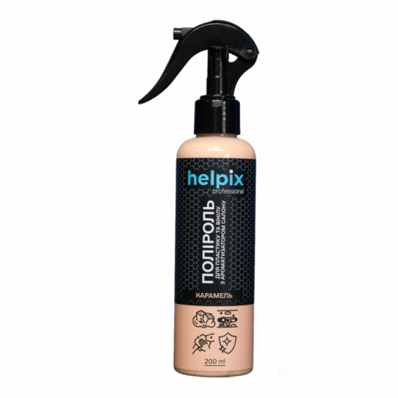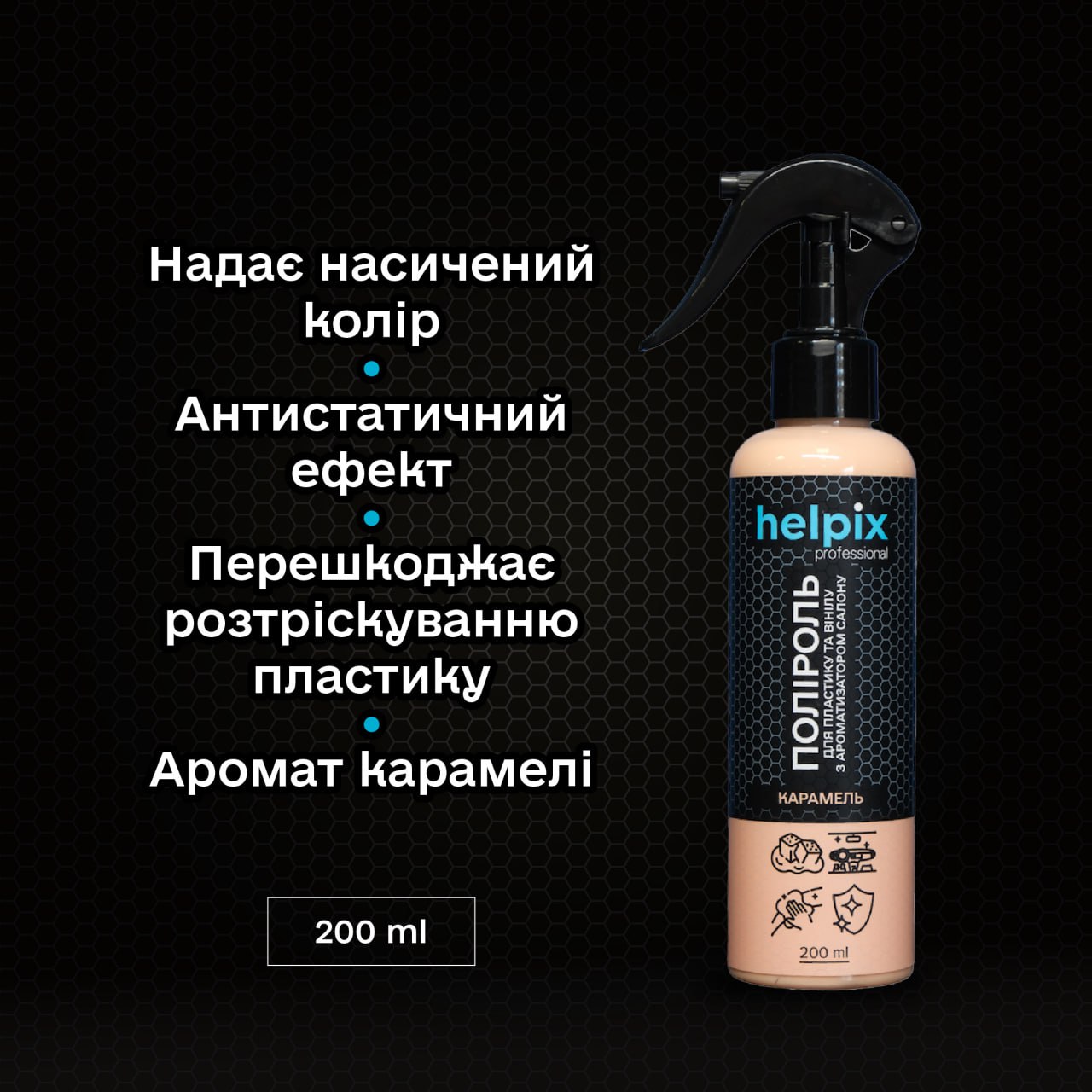 Поліроль для пластику та вінілу Helpix Professional "Карамель" використовується для очищення і захисту панелі приладів, а також усіх деталей з пластику, дерева, гуми і вінілу всередині авто. Володіє приємним ароматом карамелі, який виступає в ролі ароматизатора салону впродовж довгого періоду, знешкоджуючи запах тютюну, пилу та ін.