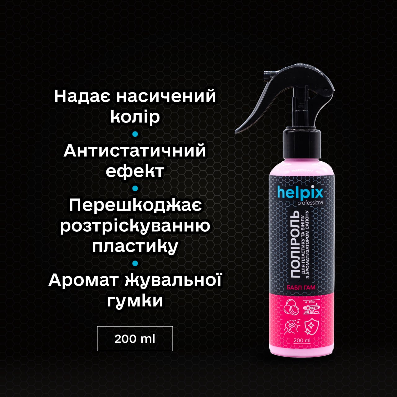 Поліроль для пластику та вінілу Helpix Professional "Бабл Гам" використовується для очищення і захисту панелі приладів, а також усіх деталей з пластику, дерева, гуми і вінілу всередині авто. Володіє приємним ароматом жувальної гумки, який виступає в ролі ароматизатора салону впродовж довгого періоду, знешкоджуючи запах тютюну, пилу та ін.