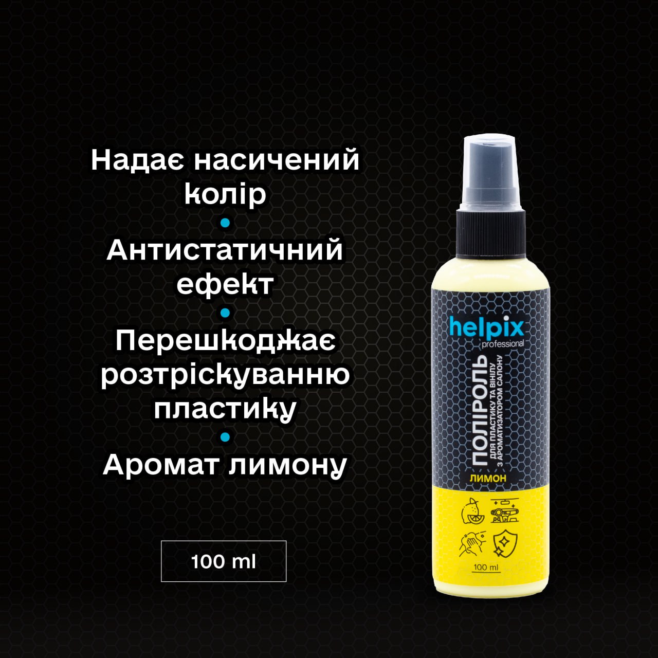 Поліроль для пластику та вінілу Helpix Professional "Лимон" використовується для очищення і захисту панелі приладів, а також усіх деталей з пластику, дерева, гуми і вінілу всередині авто. Володіє приємним ароматом лимону, який виступає в ролі ароматизатора салону впродовж довгого періоду, знешкоджуючи запах тютюну, пилу та ін.