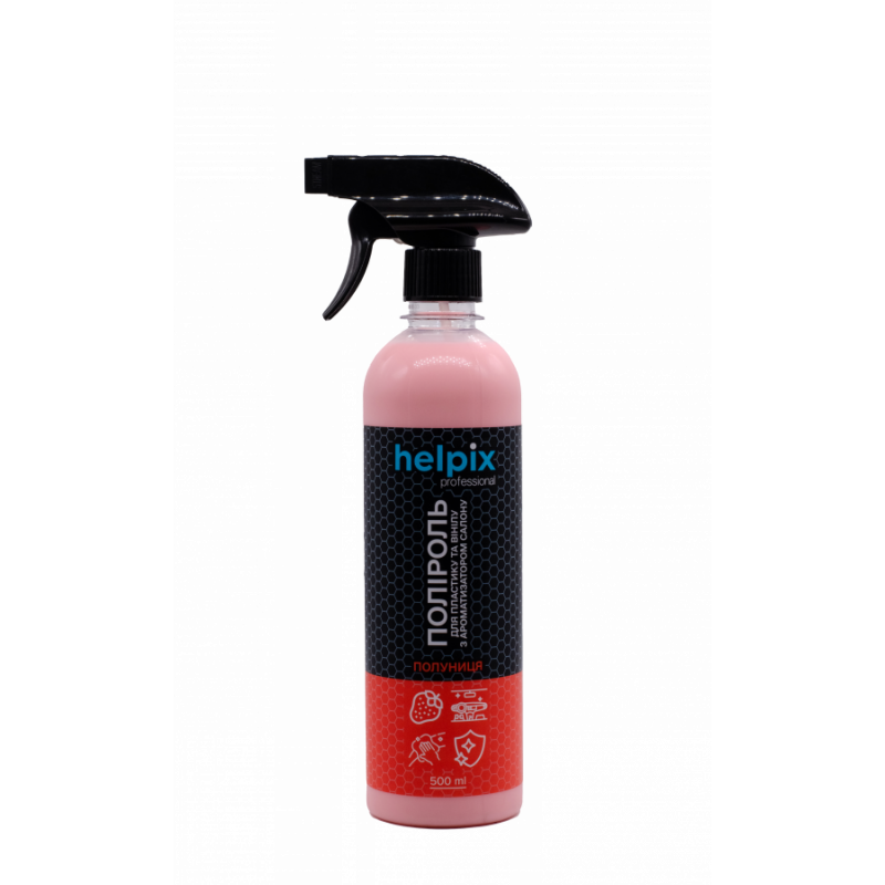 Поліроль для пластику та вінілу Helpix Professional "Полуниця" використовується для очищення і захисту панелі приладів, а також усіх деталей з пластику, дерева, гуми і вінілу всередині авто. Володіє приємним ароматом полуниці, який виступає в ролі ароматизатора салону впродовж довгого періоду, знешкоджуючи запах тютюну, пилу та ін.