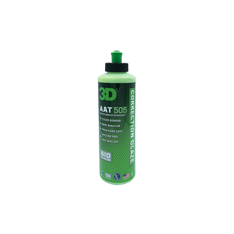 3D AAT 505 Correction Glaze 240 ml – однокрокова полірувальна паста на водній основі з додаванням воску для роторних та ексцентрикових полірувальних машин. Призначена для швидкого та ефективного видалення дрібних подряпин, павутиння з лакофарбового покриття, відновлення блиску. Може використовуватися як самостійне рішення для полірування, або завершальний етап після грубих полірувальних паст. Віск у її складі надає оброблюваним поверхням глибокий глянцевий блиск, а УФ-фільтри захистять їх від негативного впливу прямих сонячних променів.