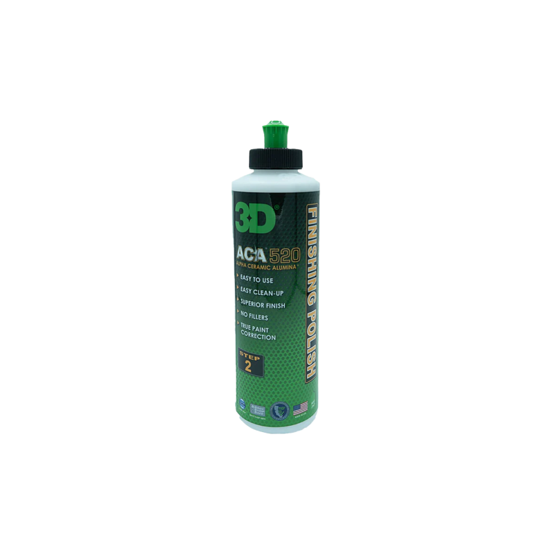 3D ACA 520 Finishing Polish 240 ml – мікробразивна полірувальна паста на водній основі для роторних та ексцентрикових полірувальних машин. У її формулі – субмікронні зерна оксиду алюмінію, створені за технологією ACA (Alpha Ceramic Alumina). Використовується для фінішного полірування та видалення дрібних дефектів лакофарбового покриття, таких як голограм, павутинки та неглибокі подряпини. Також надає оброблюваним поверхням глибокий глянцевий блиск.