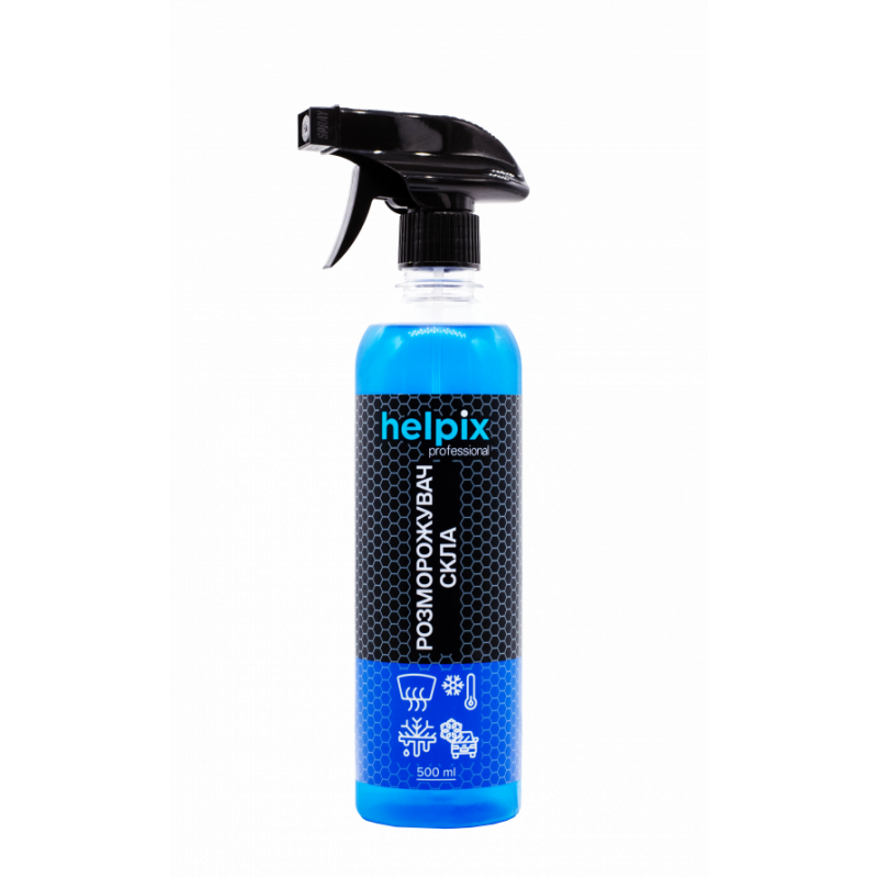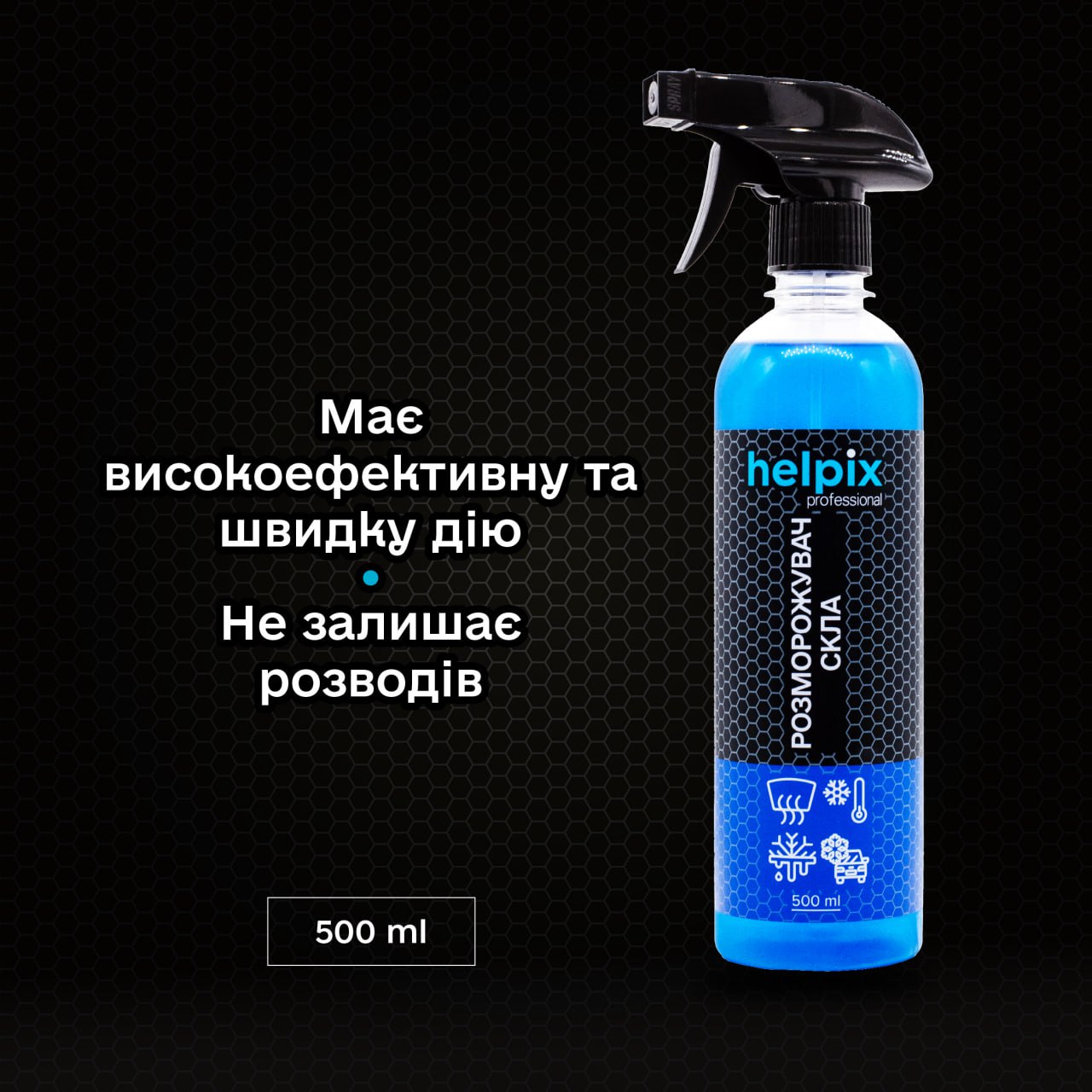 Розморожувач скла Helpix Professional – це засіб, що застосовується для швидкого видалення інею і тонкого льоду зі скла авто (лобового, заднього, а також бічних), дзеркал і скляної оптики автомобіля. Тимчасово запобігає утворенню льодового шару або інею на вікнах і фарах авто. Засіб розроблений спеціально для використання за температури нижче нуля, коли обмерзання виникають