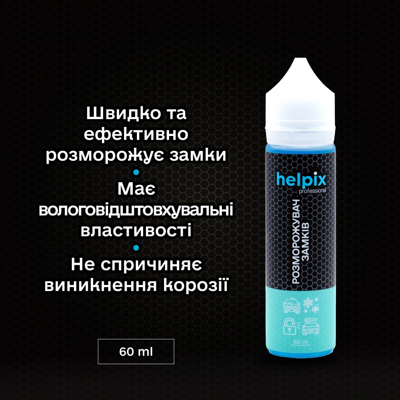Розморожувач замків Helpix Professional призначений для швидкого та ефективного розморожування замків. Завдяки унікальному складу засіб розморожує та змащує механізм замка, що попереджує повторну заморозку. Може застосовуватися для розморожування як автомобільних замків (дверей, багажника), так і в побуті (накладні та врізні замки в гараж, будинок, офіс).