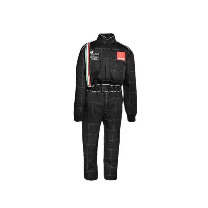 У дизайні комбінезону простежуються кольори італійського прапора: бренд віддає належне своїй батьківщині. На рукавах та спині – емблеми системи полірування кузова BigFoot та полірувальних машин Cyclo. Всі логотипи та емблеми поло нанесені методом вишивки, після прання зберігають структуру та колір.