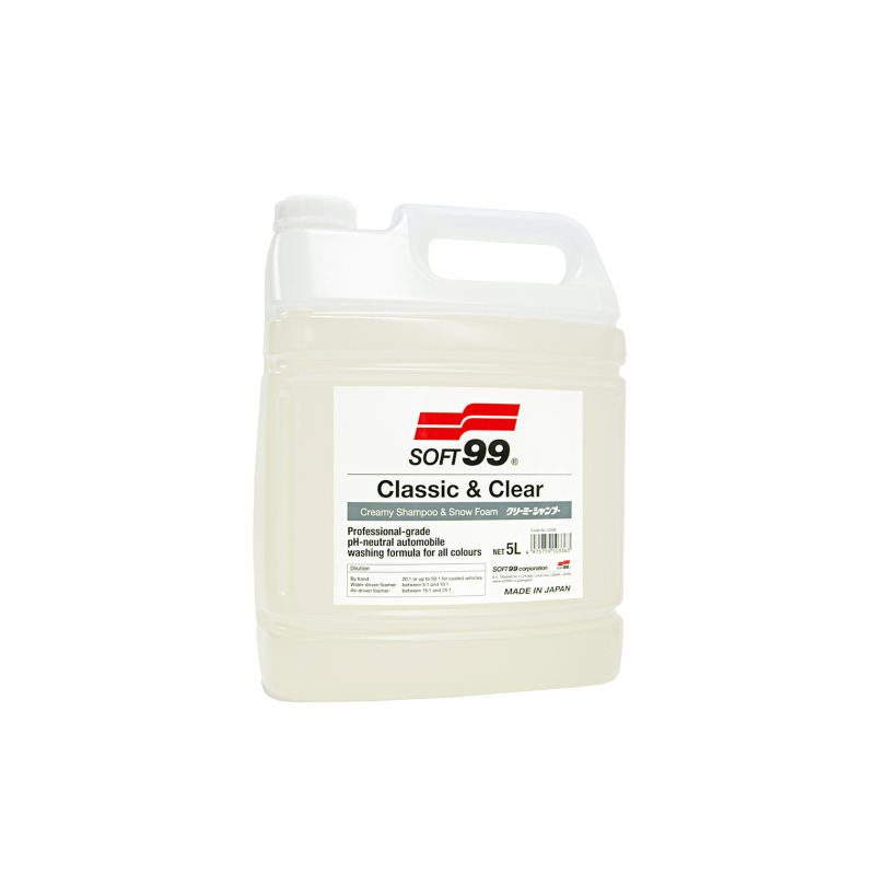 SOFT99 Classic & Clear Shampoo – шампунь для ручної мийки з нейтральним pH для другої фази двофазної дитячої лінг-мойки. Підходить для мийки як легких, так і вантажних автомобілів, автобусів, мототранспорту всіх кольорів.