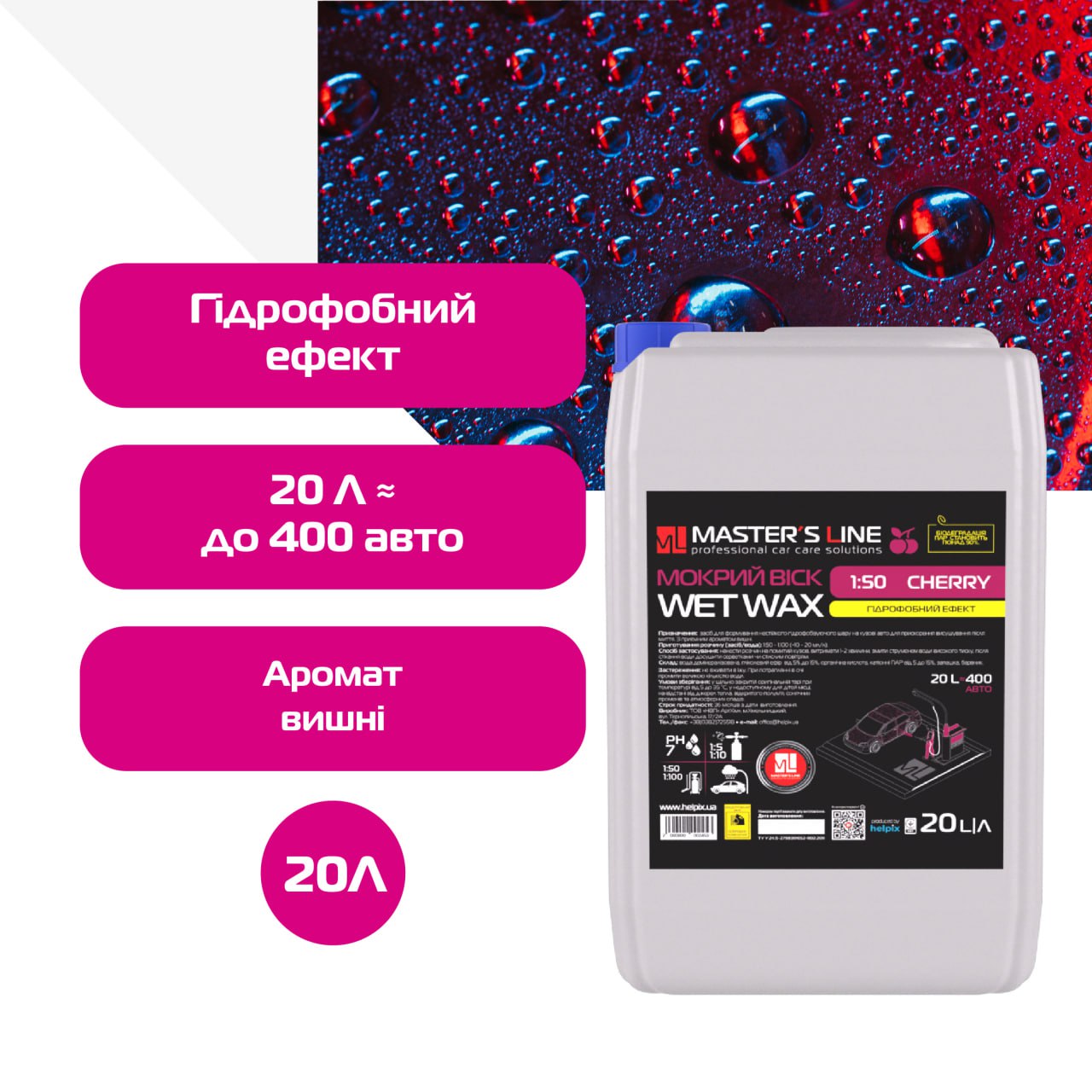 Віск для сушки Master’s Line «Cherry» 1:50 призначений для прискорення сушки автомобіля після мийки. Висококонцентрований засіб з консервуючими властивостями і захистом від ультрафіолету. Може використовуватися зі всіма типами обладнання, з жорсткою і м’якою, холодною і гарячою водою.