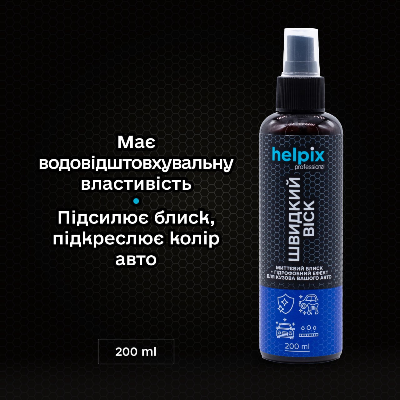 Засіб для догляду за кузовом Швидкий віск Helpix Professional – це засіб для фінішного оброблення лакофарбового покриття автомобіля після миття, формування порозаповнюючого шару на поверхні ЛКП. Освіжає колір, додає блиску, гідрофобного ефекту та забезпечує довготривале самоочищення оброблених поверхонь. Уповільнює фотокаталітичне старіння лакофарбового покриття кузова. Проникаючи у найдрібніші пошкодження ЛФП, на деякий час формує гідрофобний заповнюючий шар, що попереджає виникнення точкової корозії.